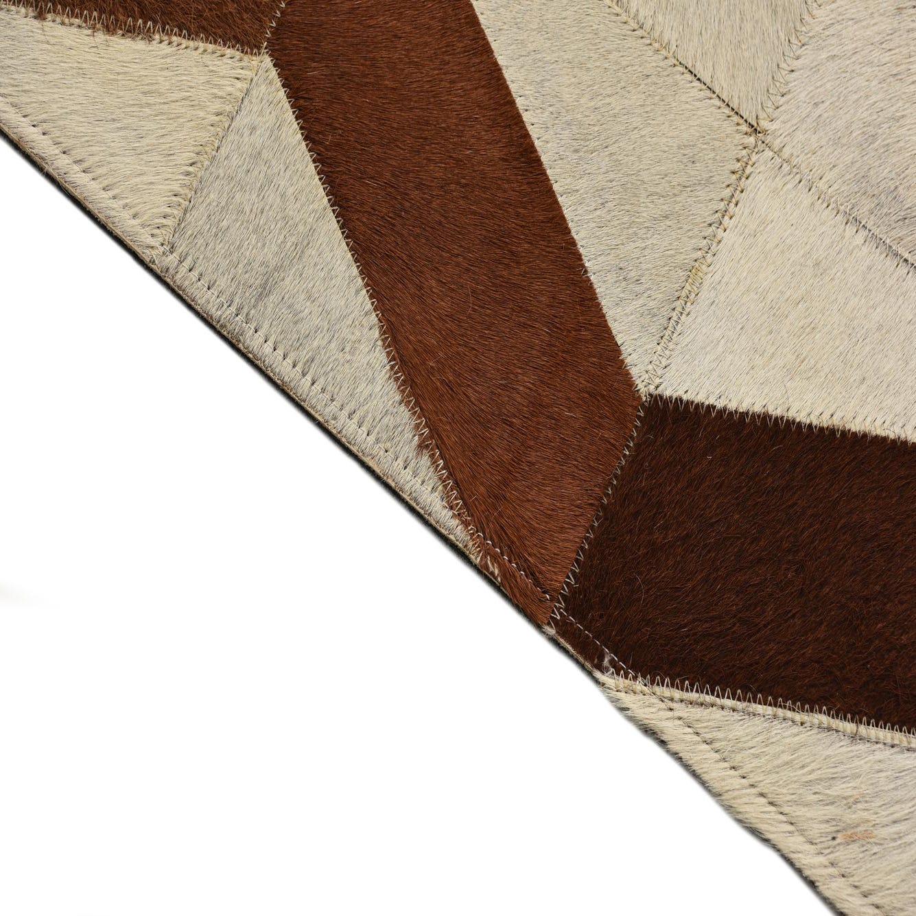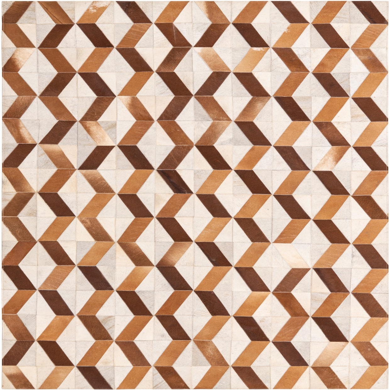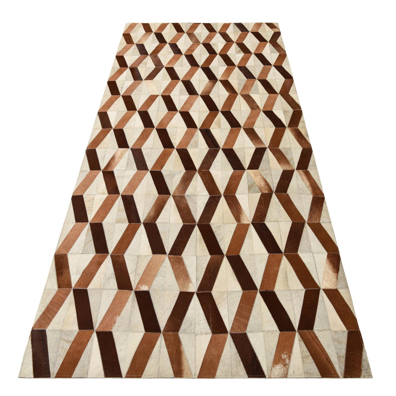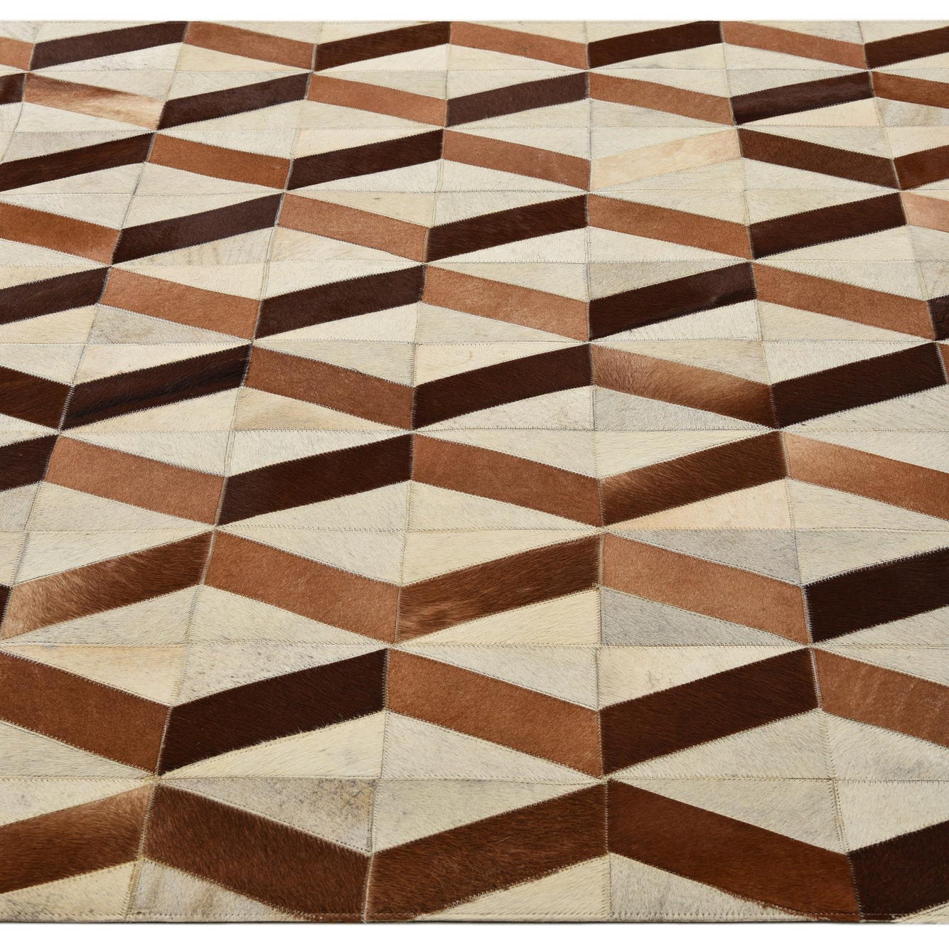 A 5x8 rectangular Cowhide rug featuring a modern geometric pattern in varying shades of brown, tan, and cream.