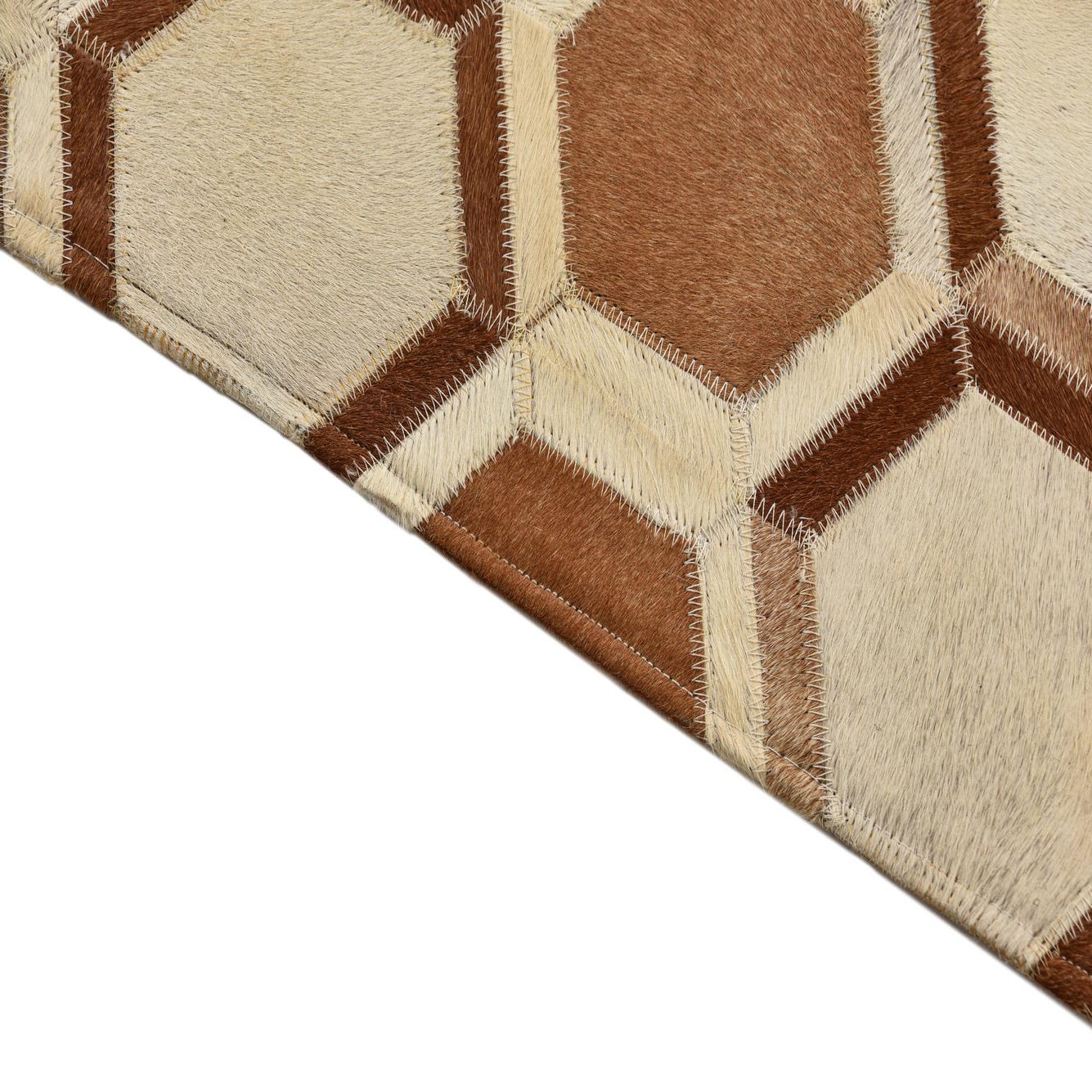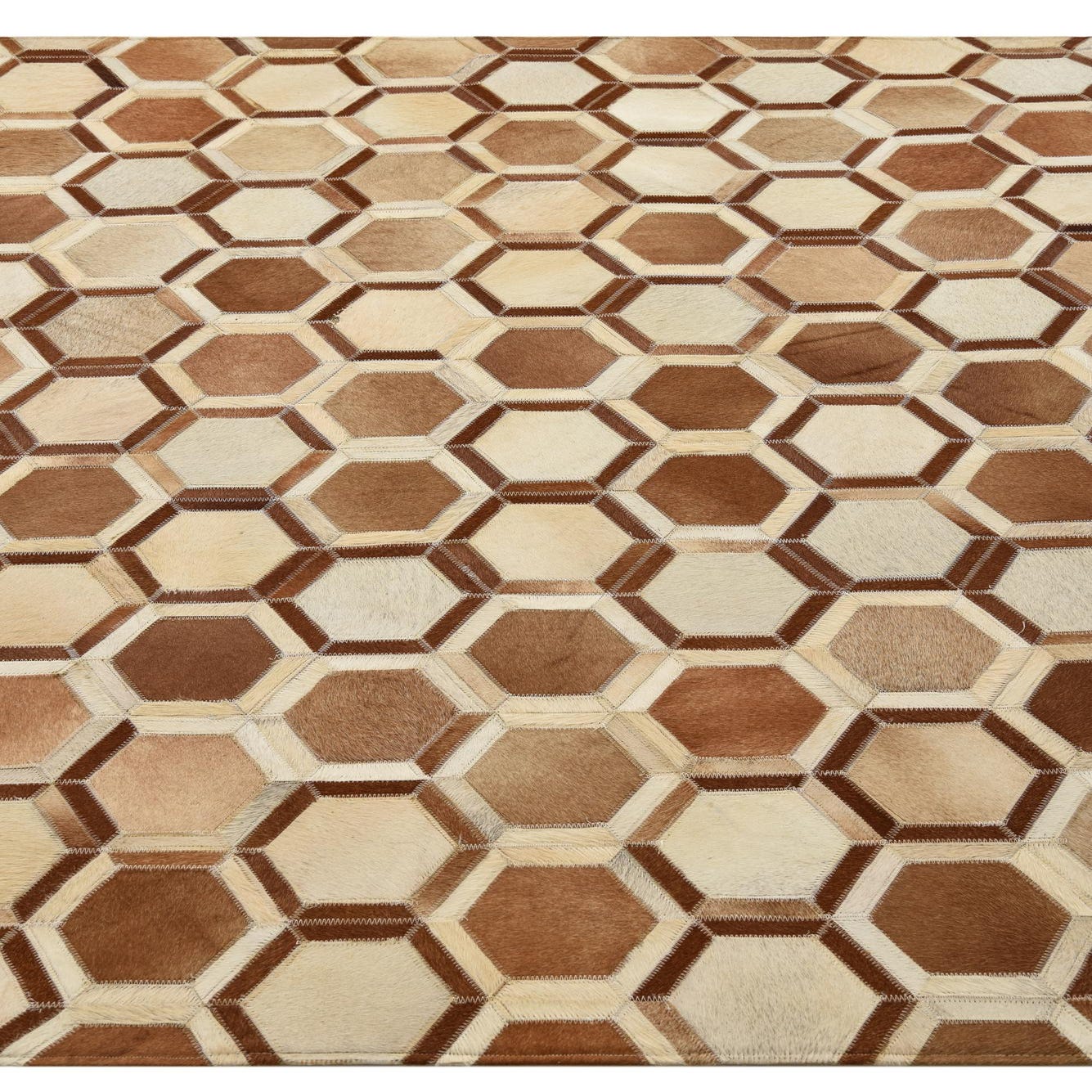 A 5x8 rectangular Cowhide rug featuring a modern honeycomb pattern in varying shades of brown and tan.