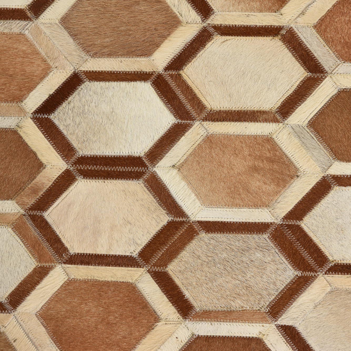 The Cowhide Collection offers a handcrafted 5x8 area rug showcasing a distinctive hexagonal pattern that exhibits a mosaic of light brown, brown, ivory, and beige hues on a light brown background. The rug's design mimics the texture and visual appeal of a natural cowhide, yet presents an organized geometry that suggests modern sophistication.
