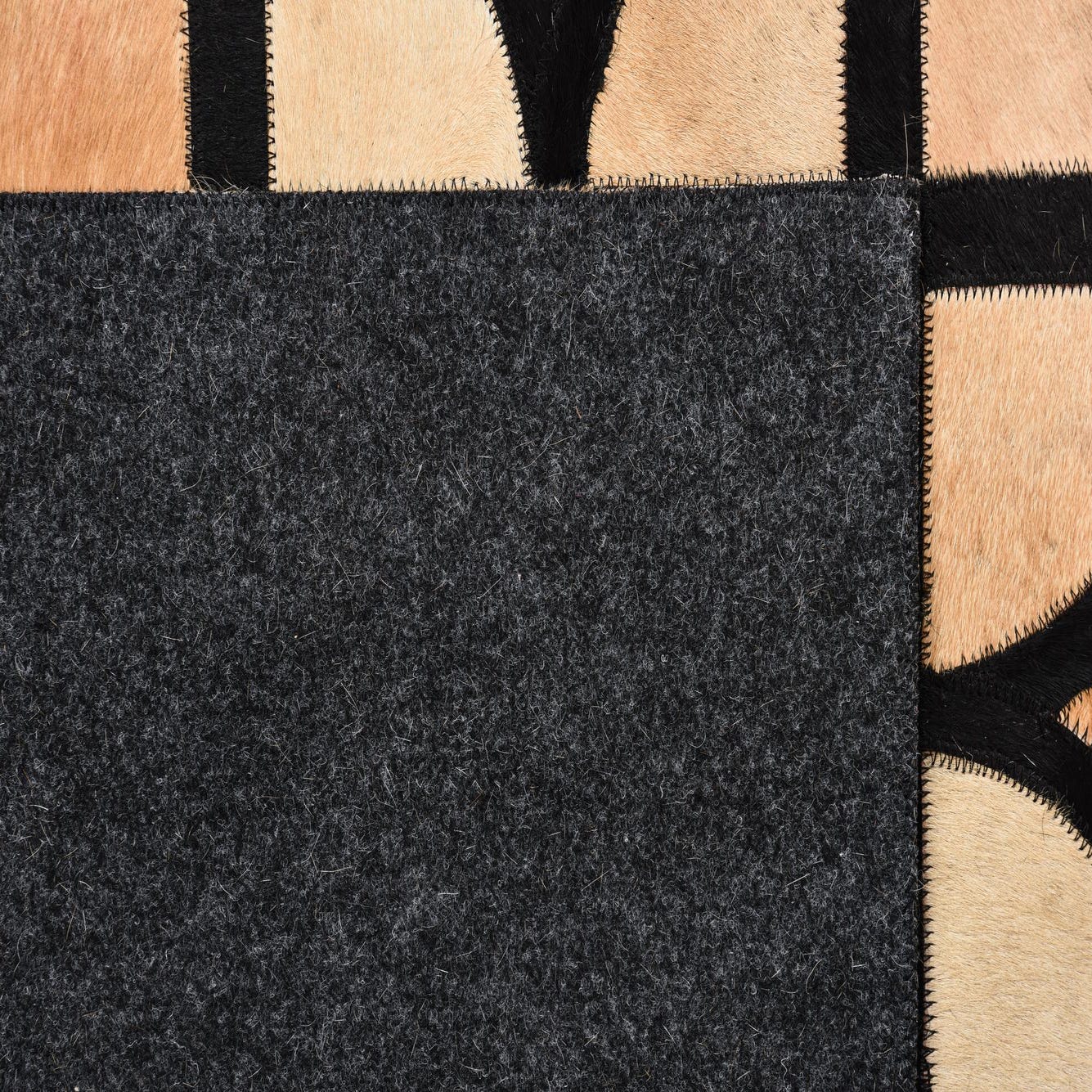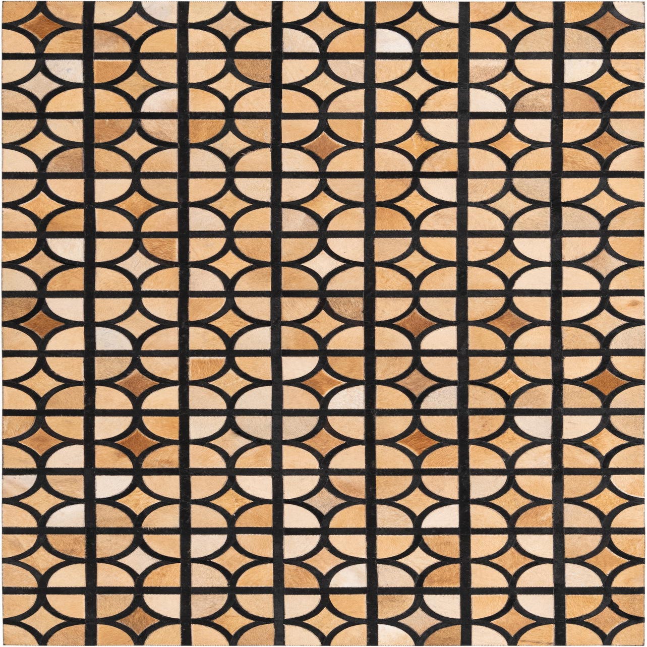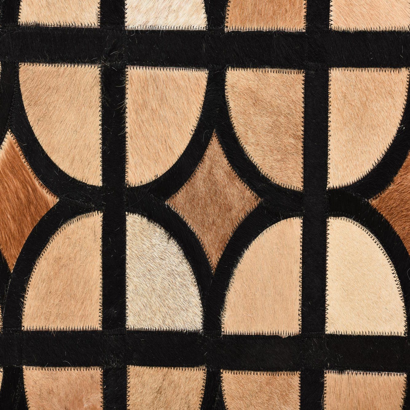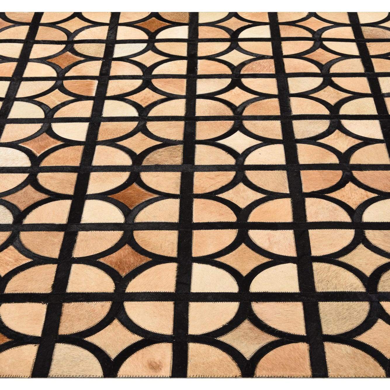 A 5x8 rectangular Cowhide rug featuring a modern geometric pattern of tan and brown semicircles and quadrants on a black grid.