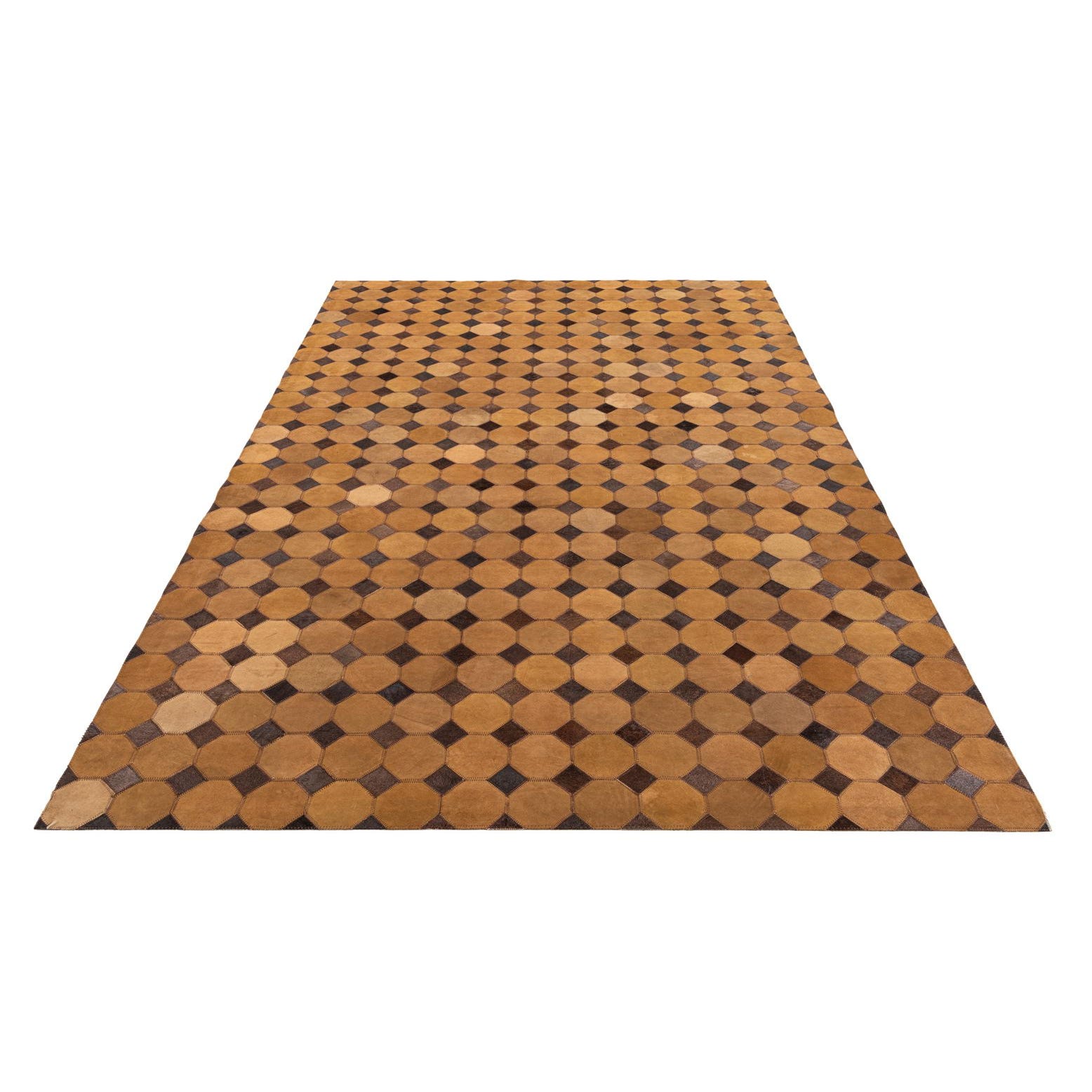 A 5x8 rectangular Cowhide Leather rug featuring an abstract pattern of octagonal brown and tan patches with smaller dark brown square patches.