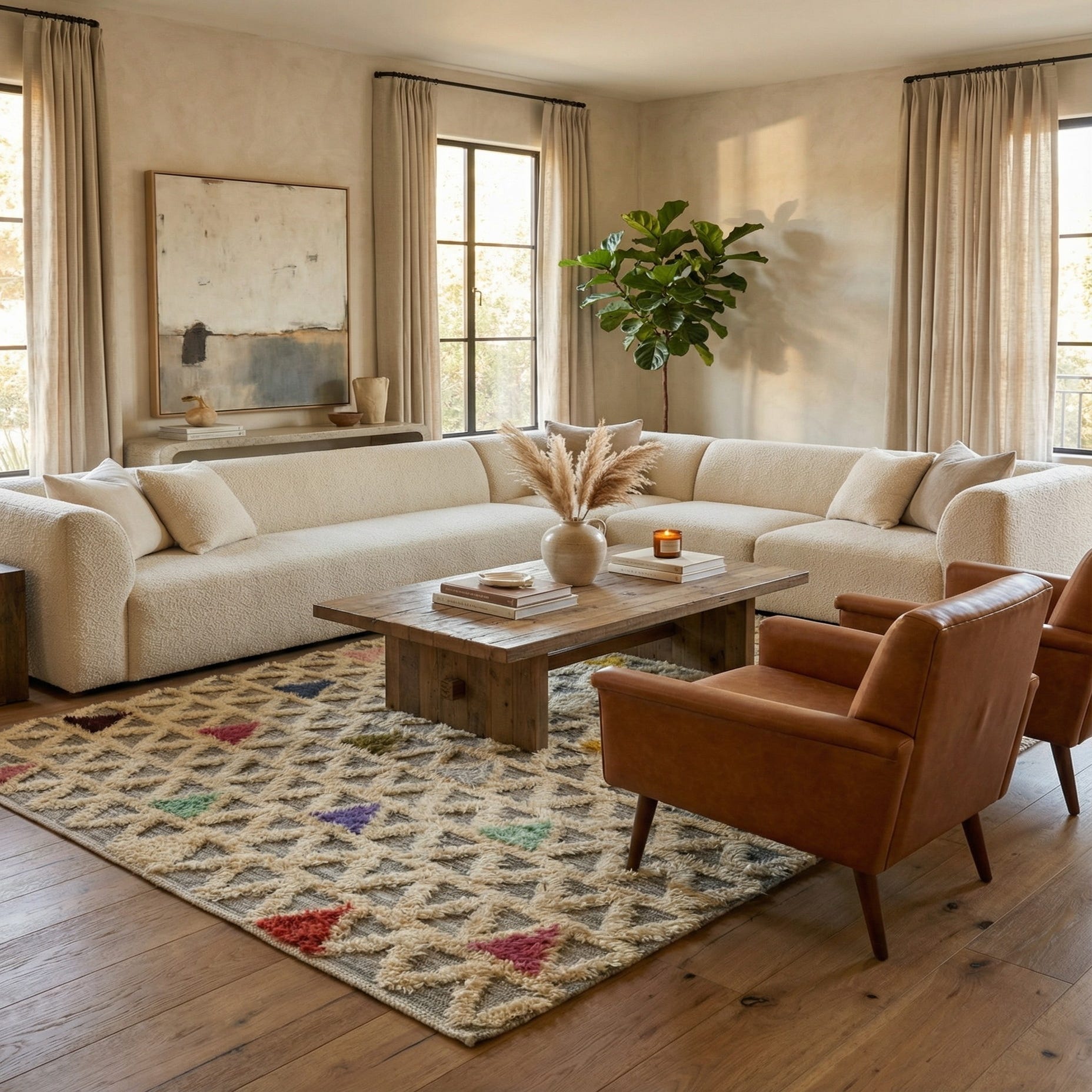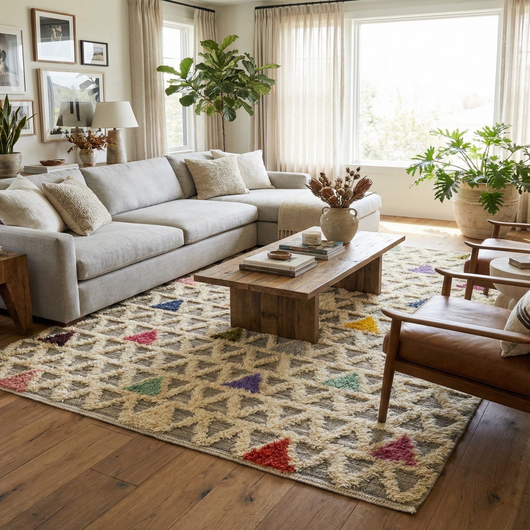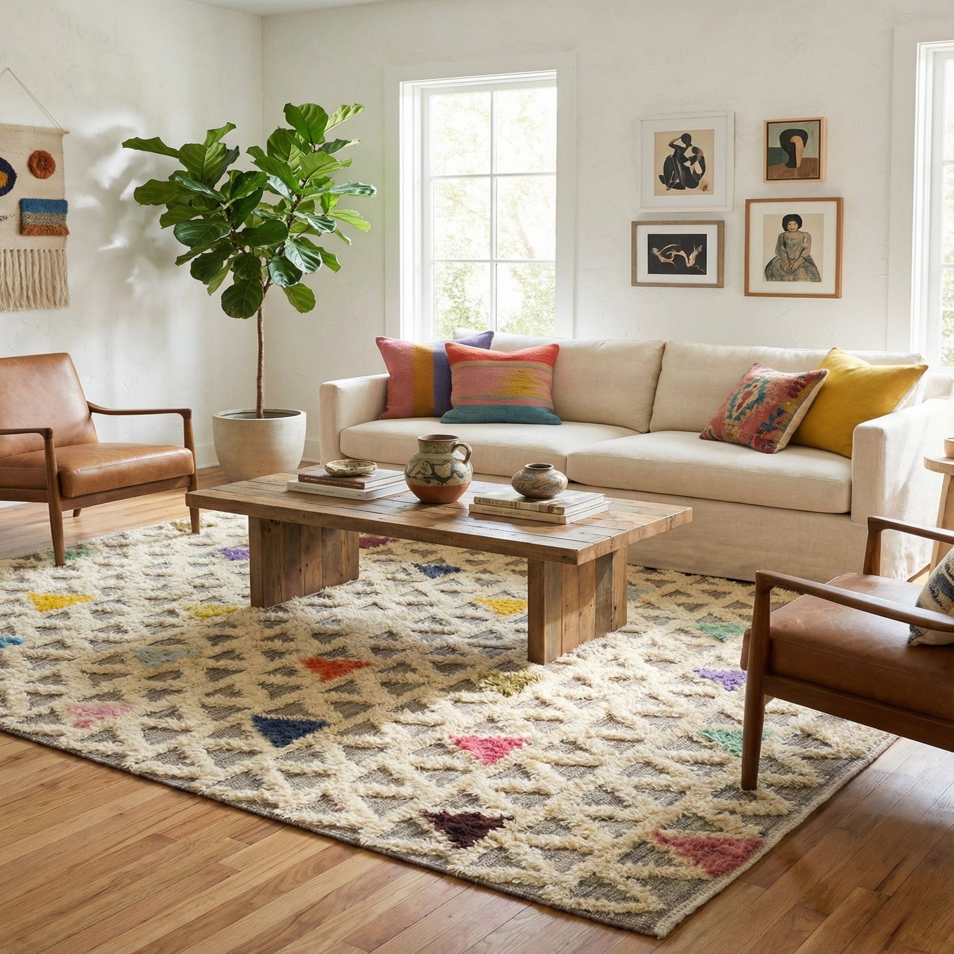 This rug works well as the center of a casual living room or layered beneath a coffee table to define a seating area. Pair it with natural wood tones and linen upholstery for an earthy, modern-boho look, or use it to introduce color into a clean, Scandinavian-inspired space. It also complements eclectic and transitional interiors—mix with leather, woven textures, and simple metallic accents to bring the pattern and palette together.