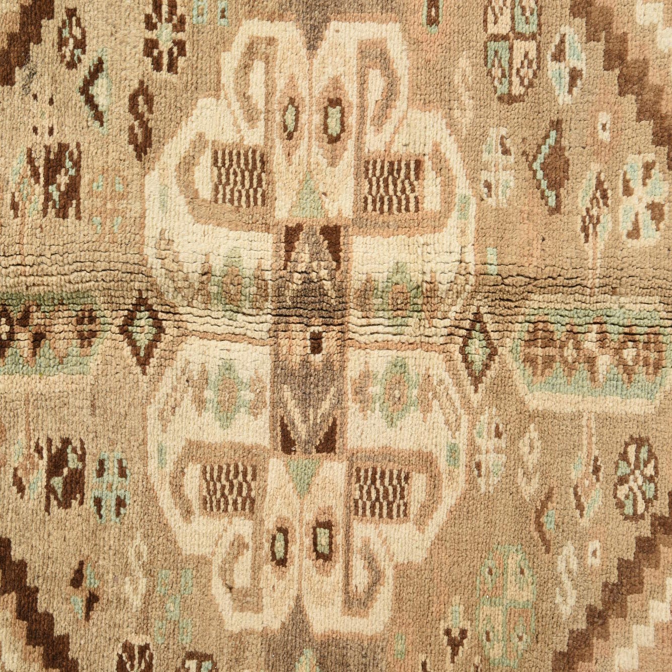 Primary color is Light Brown. Colors in this rug include: Light Brown, Brown, Ivory, Green.
