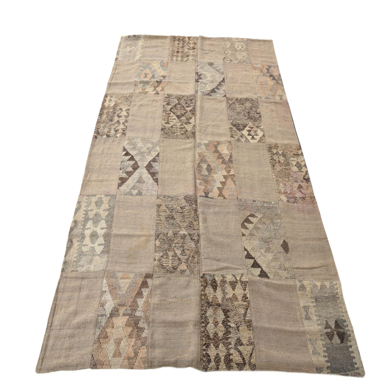 A 5x8 rectangular Kilim Patchwork rug with a tribal pattern in various shades of brown and tan.