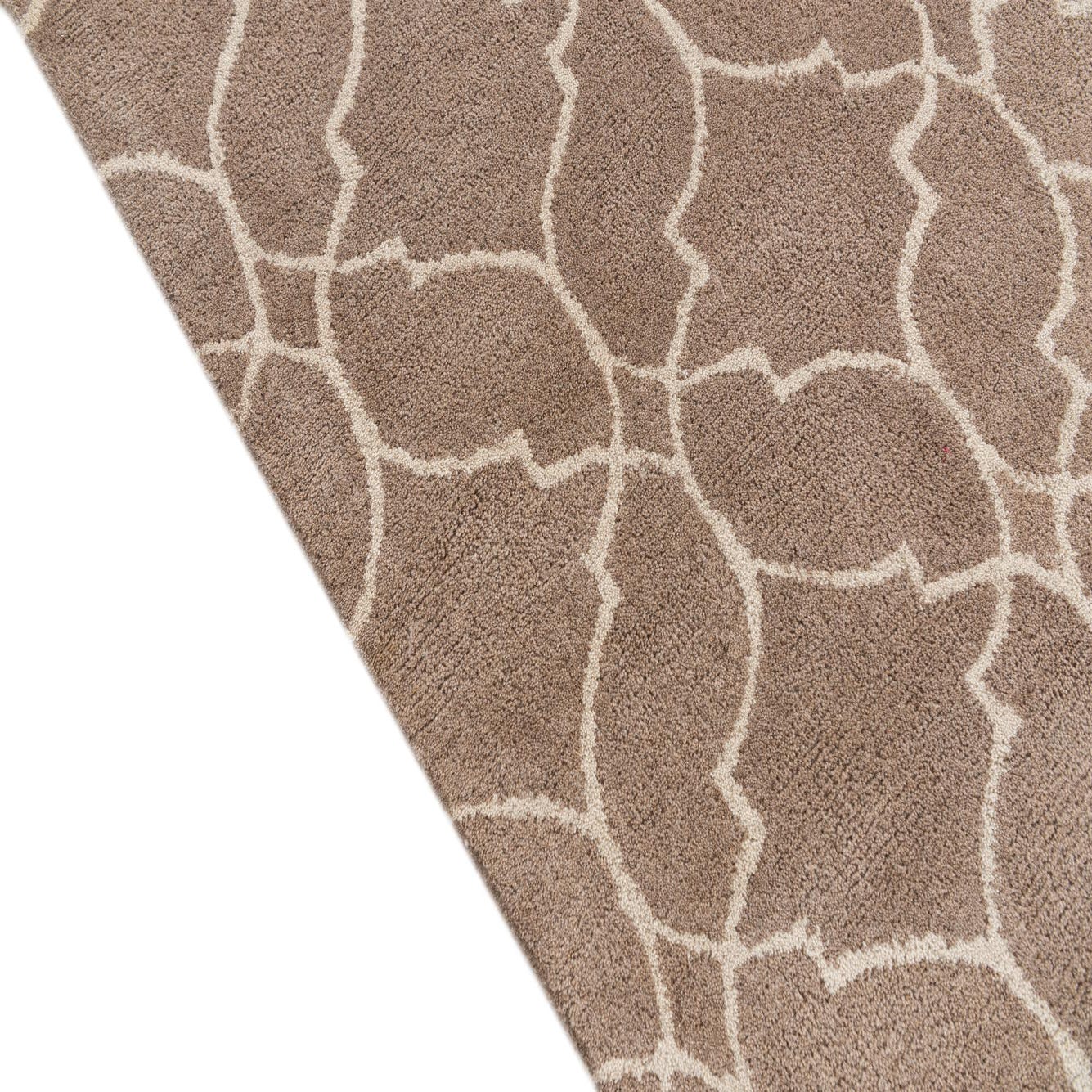 A 5x8 rectangular brown and tan wool rug with a high pile and modern abstract pattern, suitable for a living room or bedroom.