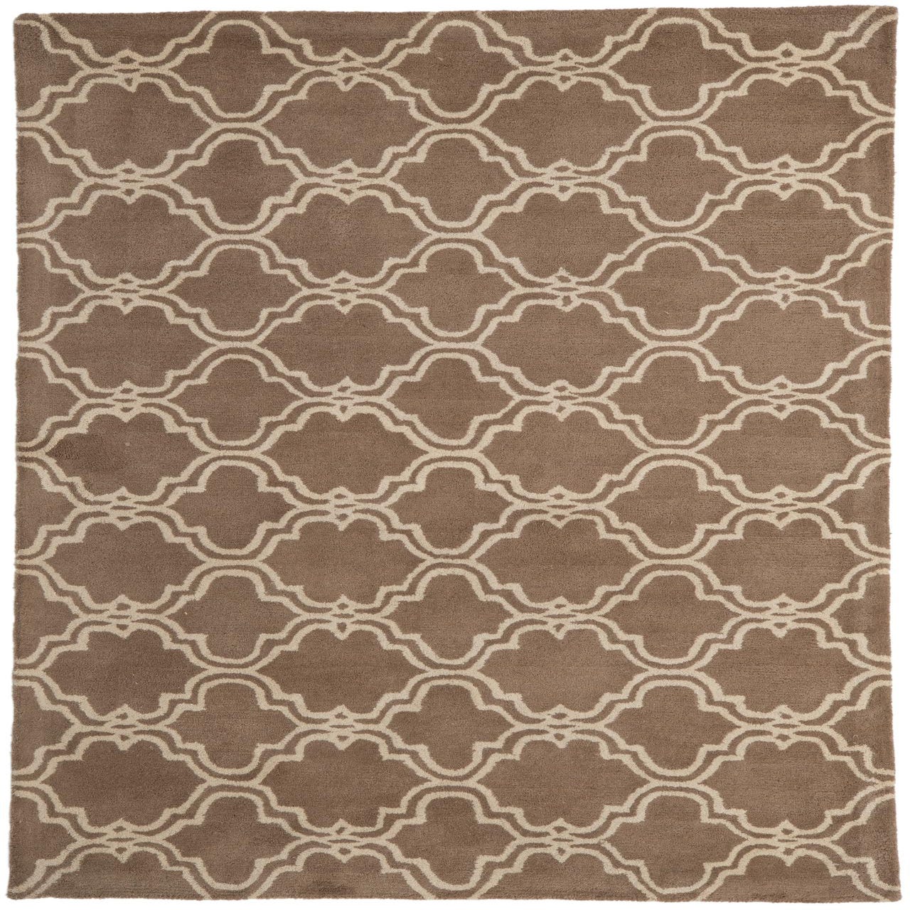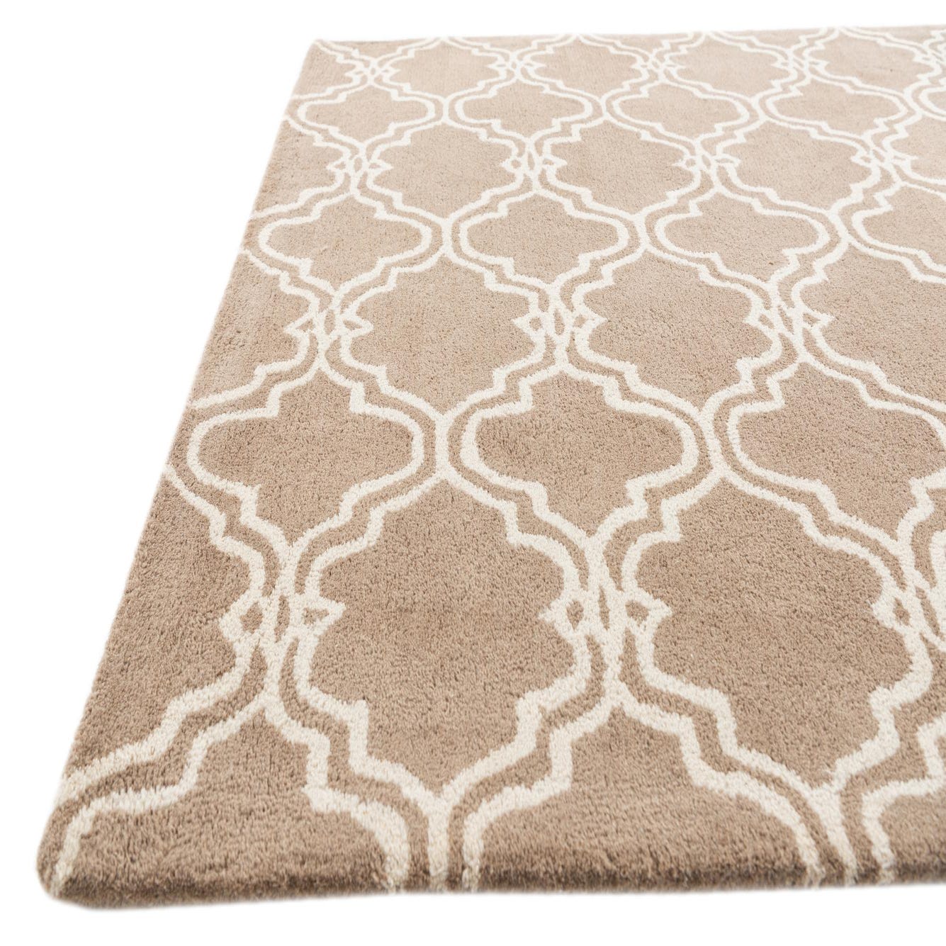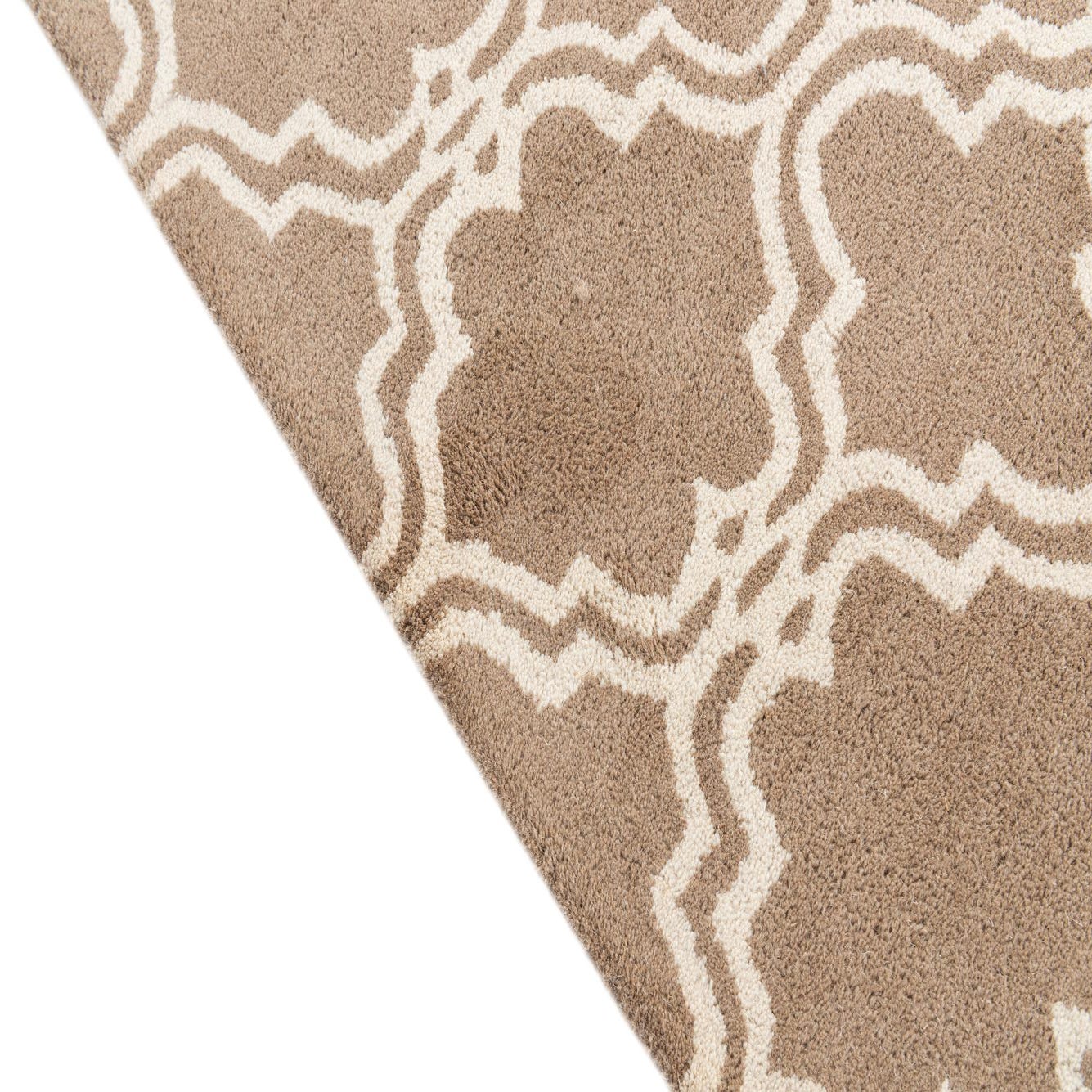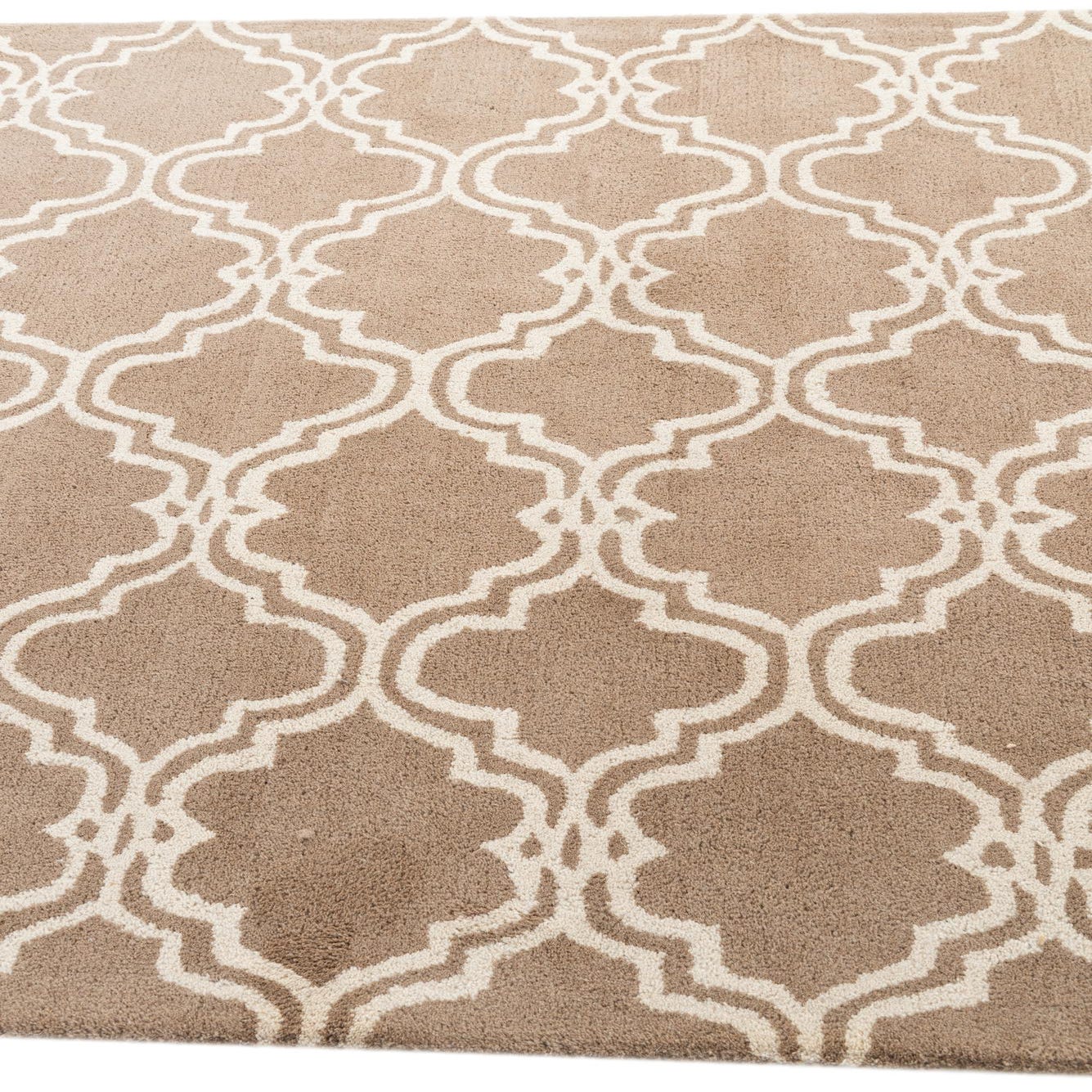 The Luna Collection presents a hand-tufted rug meticulously crafted from a blend of wool and cotton, creating a durable yet comfortably soft texture underfoot. This 5x8 piece showcases a harmonious light brown background, complemented by a subtle beige pattern that echoes traditional Moroccan motifs. The rug displays an array of stylized quatrefoils interconnected to form a lattice-like framework, lending a sense of order and classical elegance to the design.