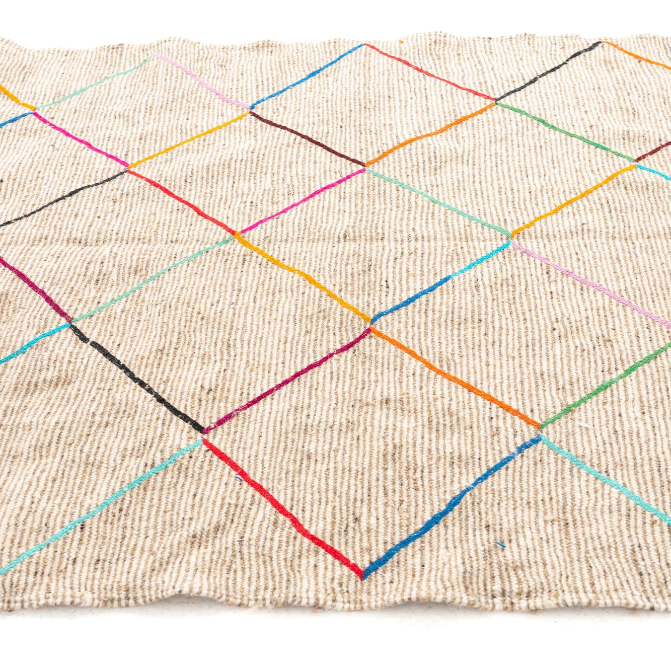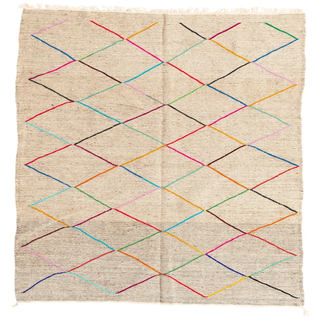 A 5x8 rectangular Moroccan shag rug with a natural brown and tan base, featuring a vibrant, colorful diamond lattice pattern.