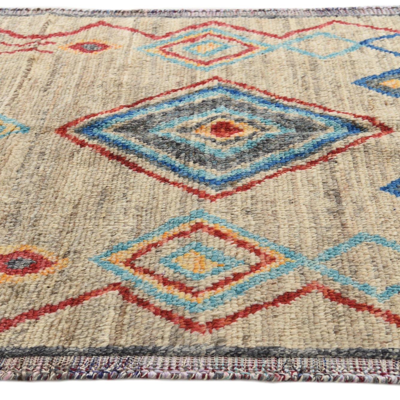This Moroccan collection rug is a hand-knotted piece crafted from 100% wool, measuring 5x8 feet. The rug displays a compelling array of geometric patterns that evoke traditional North African design. Its light brown background serves as a neutral canvas for a melody of colors including blue, brown, red, orange, light blue, and black accents. Each color is thoughtfully placed, creating diamond and angular motifs that impart a sense of balance and rhythm across the surface.