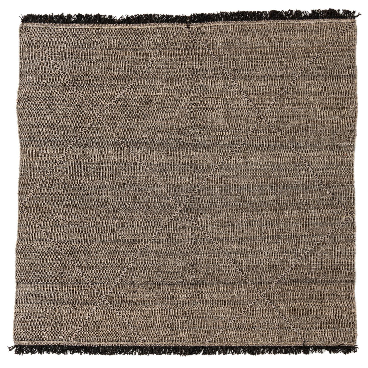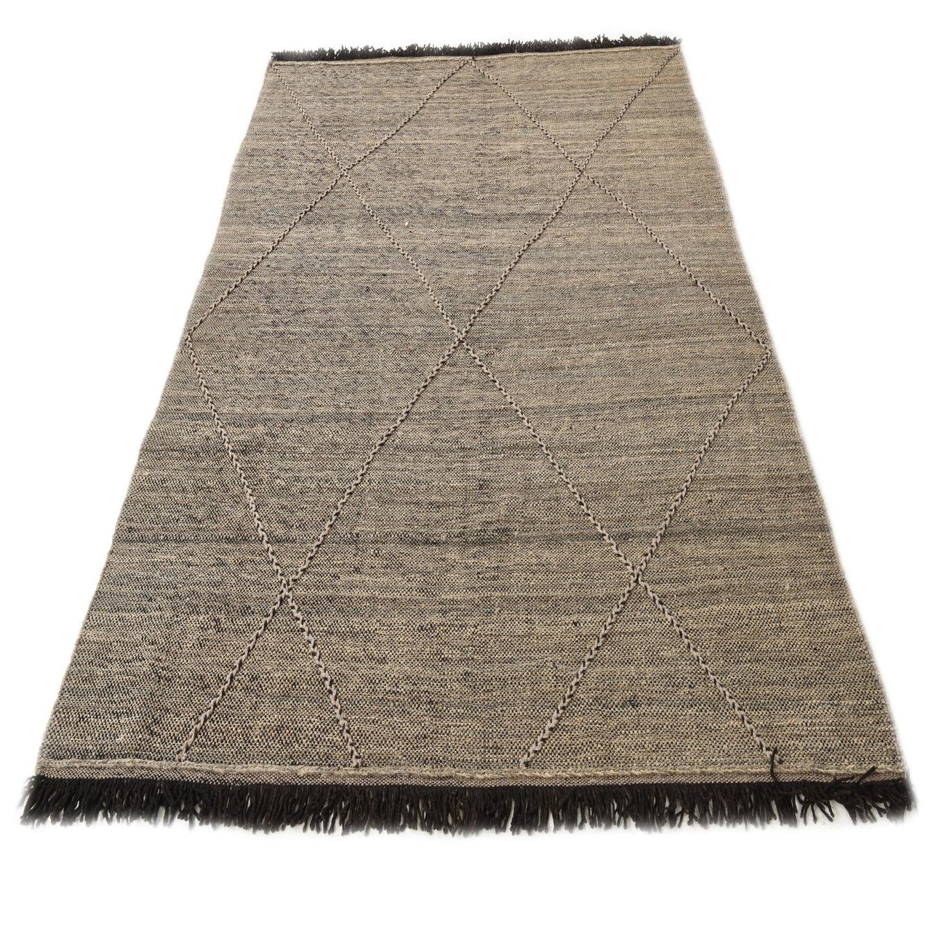 This Moroccan collection rug is hand-knotted of 100% wool, offering a balance of comfort and durability. The 5x8 rug showcases a minimalist pattern with bold, intersecting diamond shapes in a deeper brown hue set against a light brown background. The design is a nod to traditional Moroccan motifs, while its simplicity allows it to blend seamlessly into contemporary and transitional spaces alike.