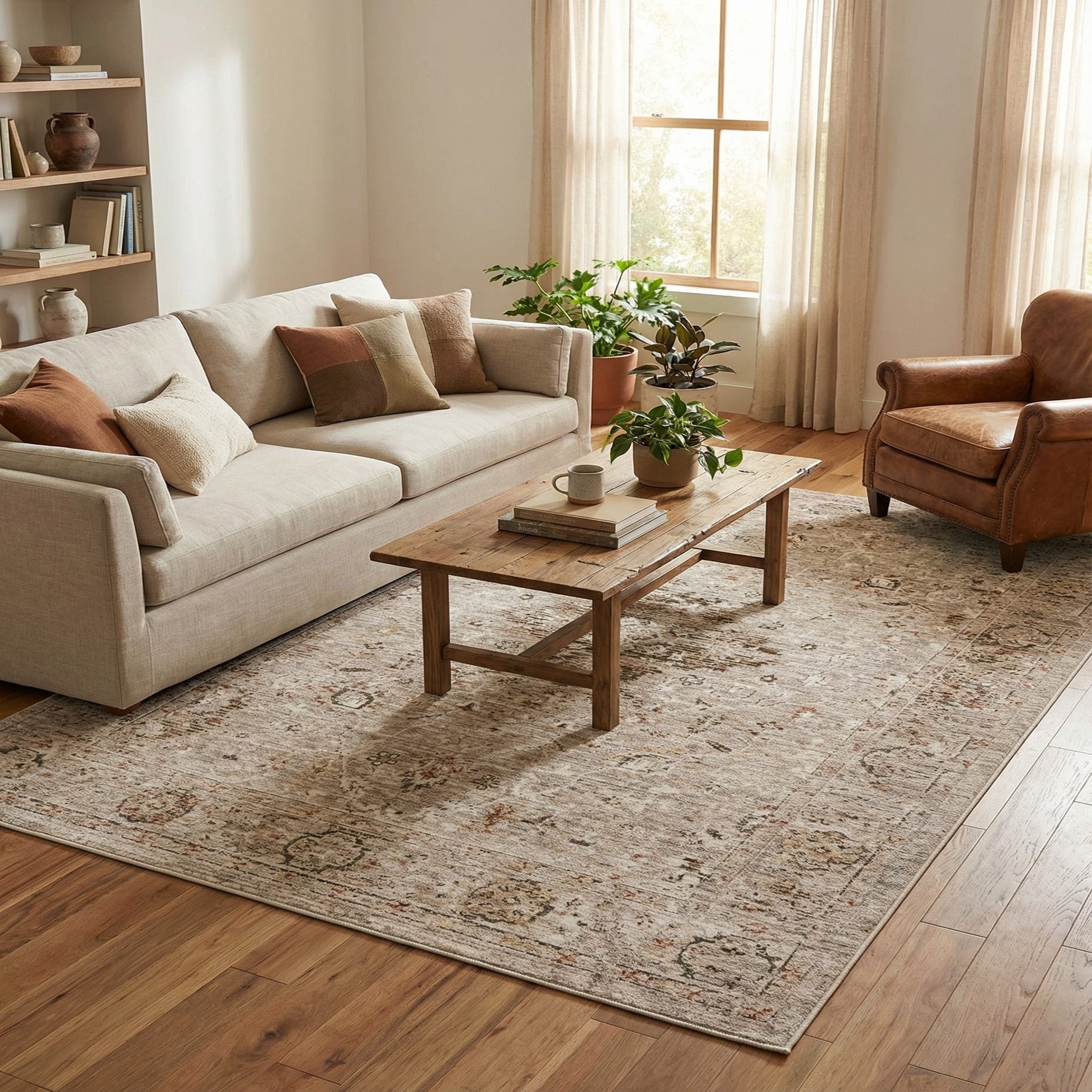 A 5x8 rectangular indoor rug with a traditional medallion pattern in varying shades of brown and tan.