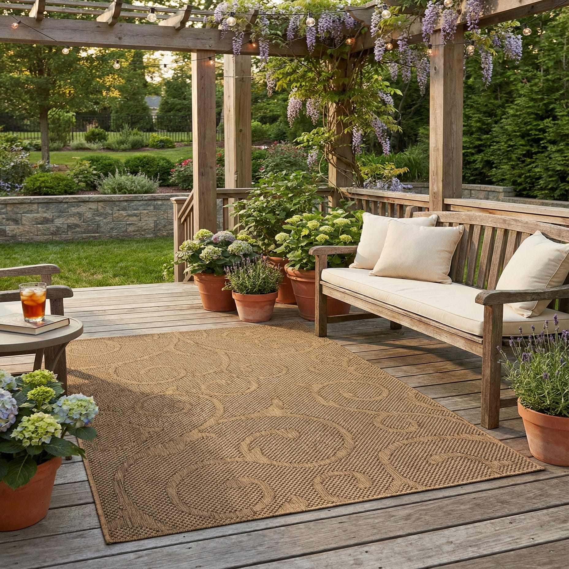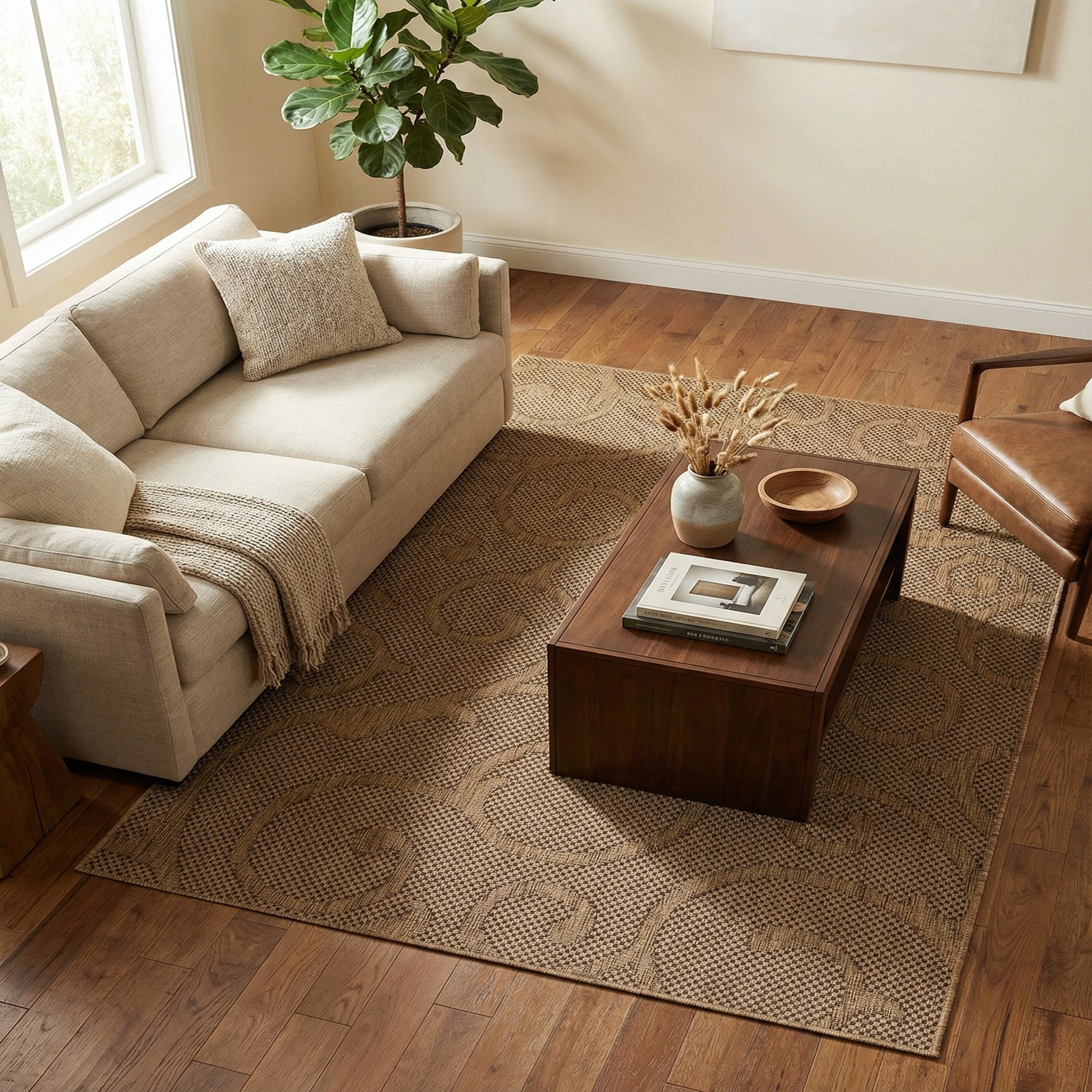 This rug pairs naturally with outdoor wicker and teak furnishings, a covered porch or sunroom with neutral cushions, or a casual dining area that favors earthy tones and simple lines. It also complements transitional interiors—think natural wood, matte metal accents, and woven textiles—where a durable, patterned foundation softens harder surfaces without overwhelming the scheme.