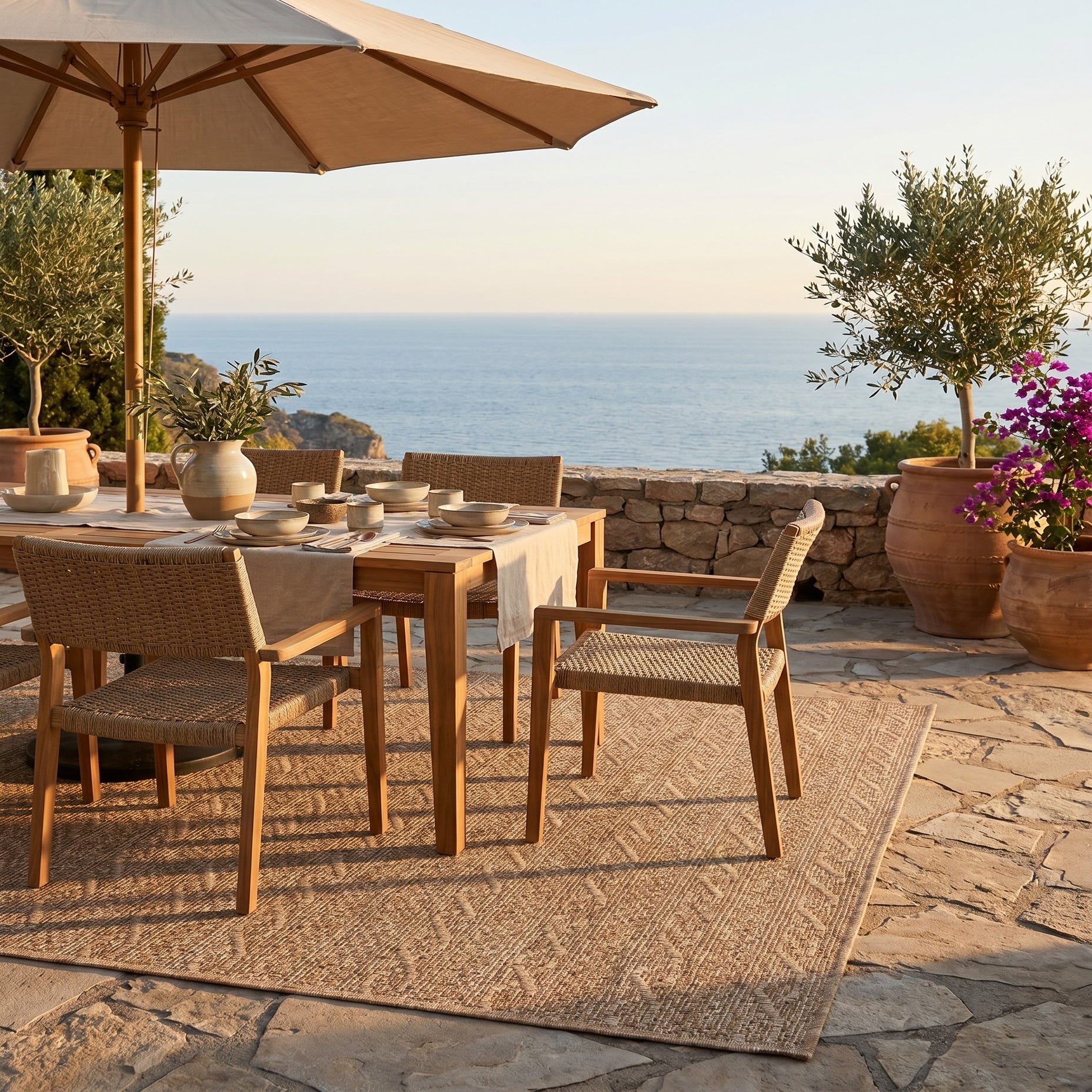 This rug looks rich and feels very durable. I shopped for a couple of weeks online everyday in search of a reasonably priced rug that was good looking and had great reviews. All of the outdoor rugs that I could afford and that looked great had terrible reviews about how horribly made they were. I came upon this one it had wonderful reviews and it was on sale for less than 100.00! It came nicely rolled instead of folded like other sites which meant it had no permanent creases I unrolled it and it was sturdy expensive looking and it laid perfectly flat! You won't be sorry if you purchase this!