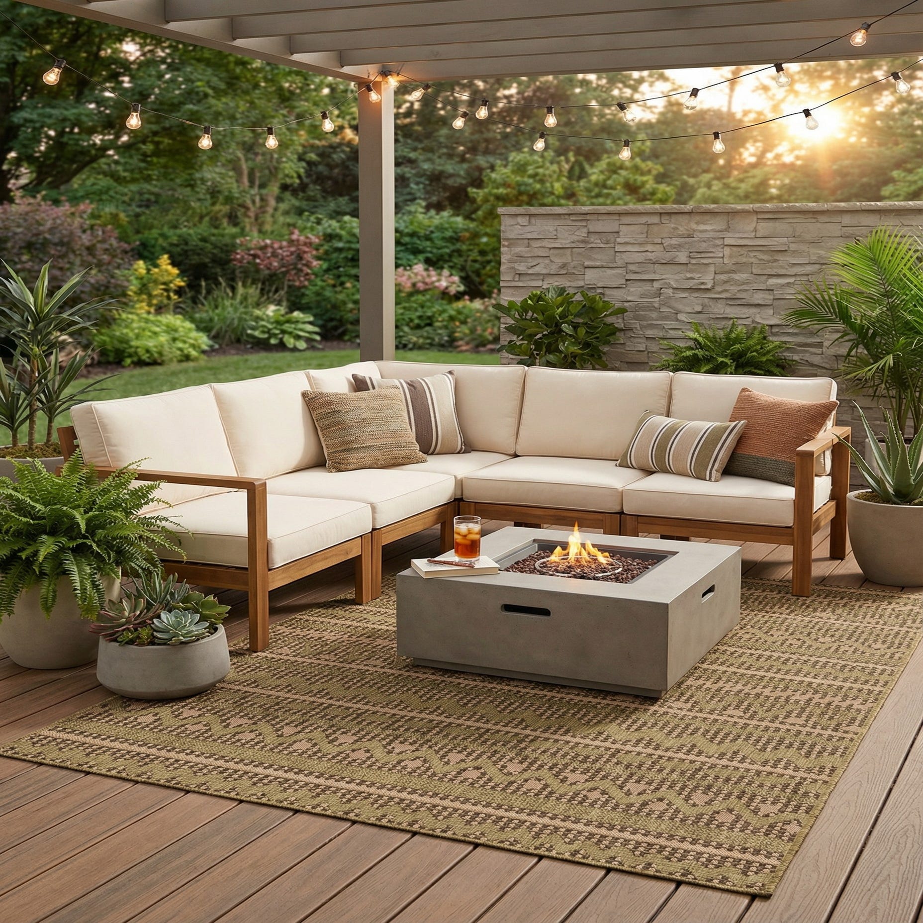 This piece works well in covered outdoor settings, a sunroom, or an entry where a durable, low-key anchor is needed. Pair it with warm wood or rattan furniture, neutral linen upholstery, and metal accents for a contemporary outdoor living or casual indoor space; it also complements boho and modern farmhouse palettes that favor earthy tones and layered textures.