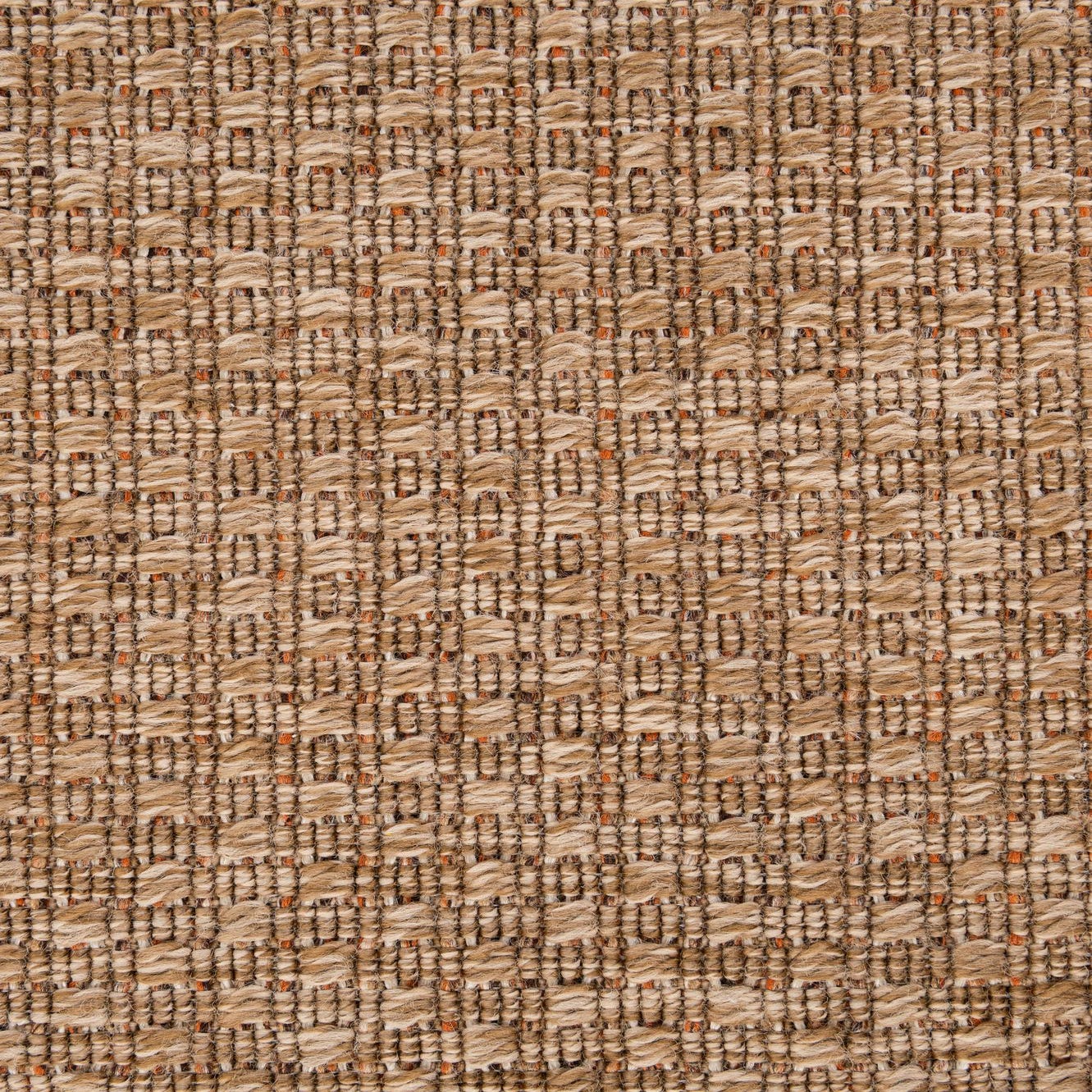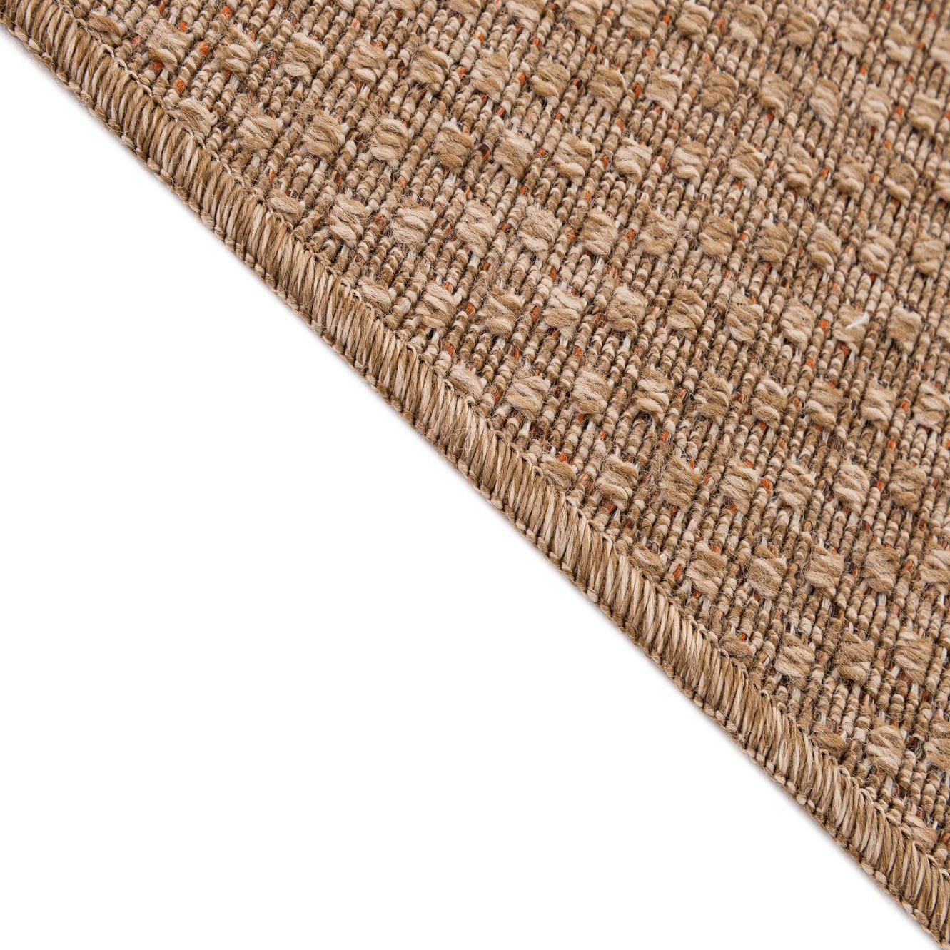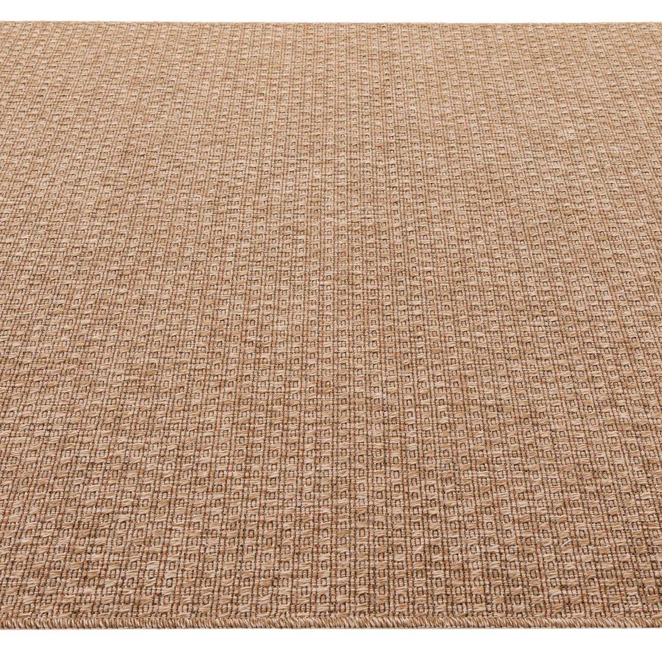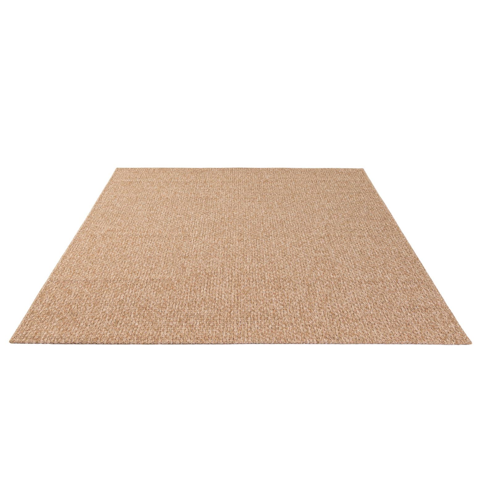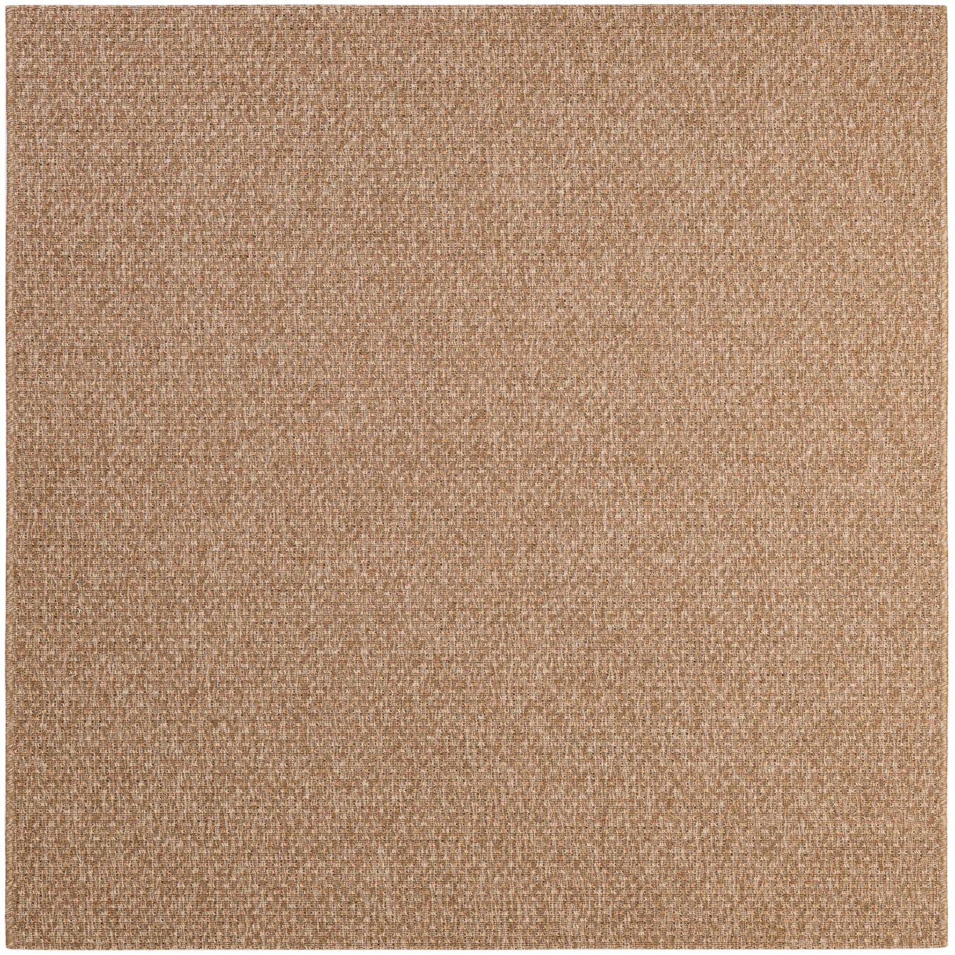 A 5x8 rectangular indoor/outdoor rug in a solid brown and tan modern flatweave texture, suitable for patios or living rooms.