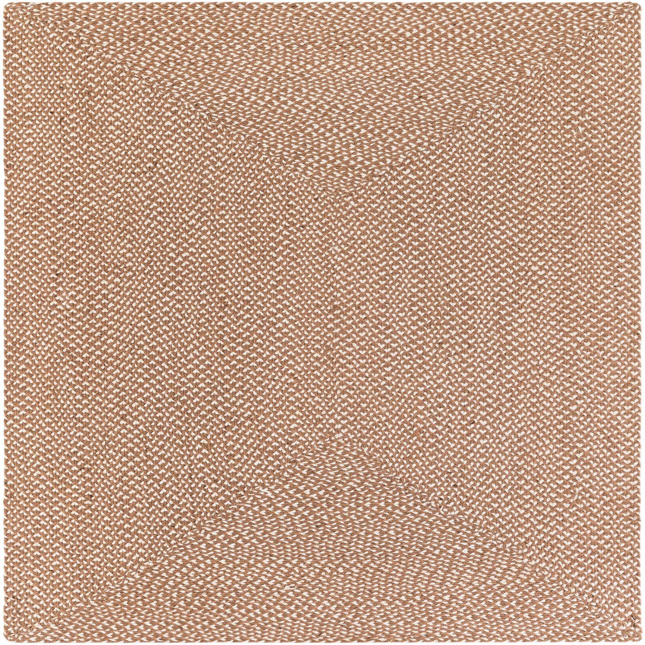 Hand braided of 100% jute, this rug displays a tight, tweed-like braid in a light brown ground threaded with ivory accents. The braids are arranged into concentric rectangular bands that create a subtle framed pattern across the surface, giving the piece structure without a bold motif. Underfoot the jute provides a firm, textured feel with a low profile and a natural, muted sheen that highlights the two-tone weave.