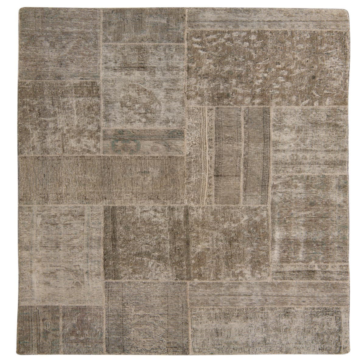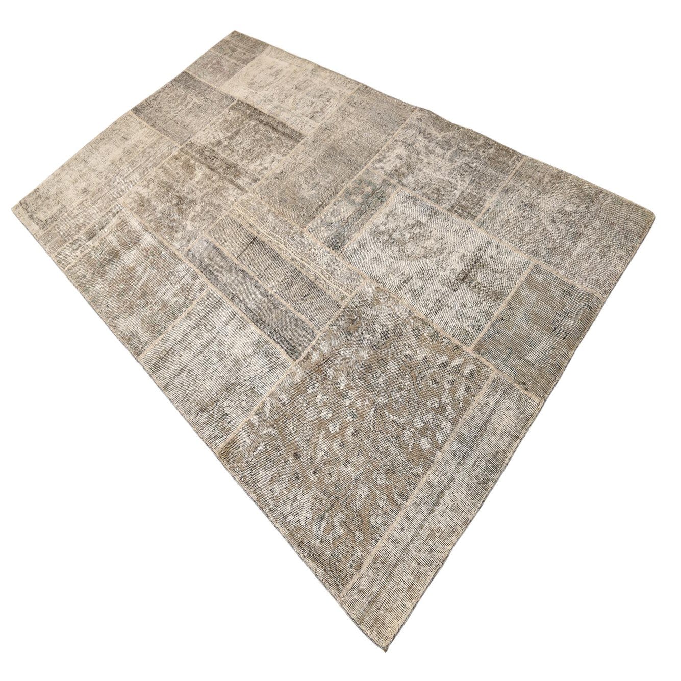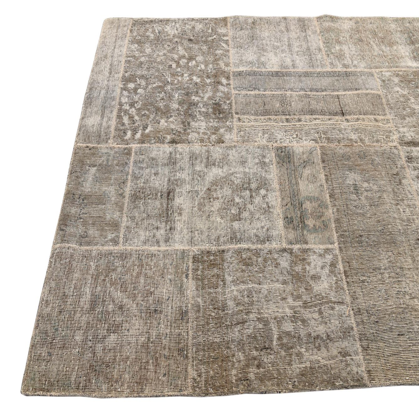 The Ultra Vintage rug is a 5x8 hand-knotted carpet, crafted with 100% wool, ensuring durability and a soft touch underfoot. This rug showcases a patchwork of patterns, including hints of intricate motifs and subtle stripes that suggest a bygone era of craftsmanship. The color palette is warm and earthy, with hues of light brown and tan providing a versatile foundation, complemented by accents of teal and ivory that add depth and interest to the design. The background color of light brown anchors the composition, lending a sense of cohesion and warmth.