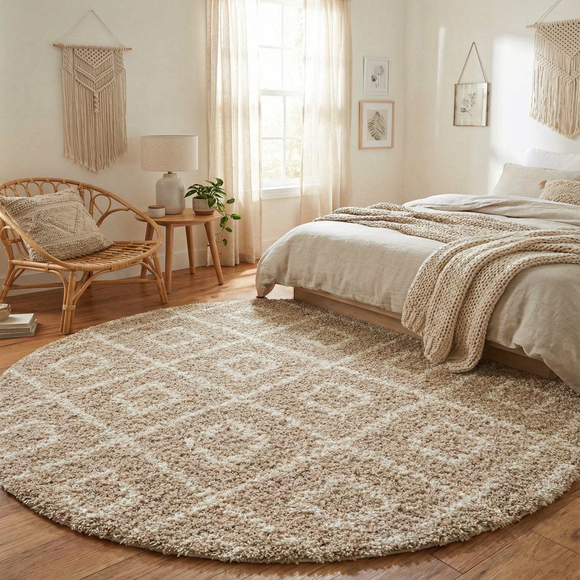 A plush shag with a warm light brown background, this round rug is anchored by an ivory geometric lattice that forms nested diamond motifs across the surface. The high, dense pile of 100% polypropylene gives the rug a soft, cushiony hand while the slightly shorter ivory fibers trace the pattern, creating subtle texture and depth you can feel underfoot. Machine-made construction keeps the pile even and the design consistent across the face.