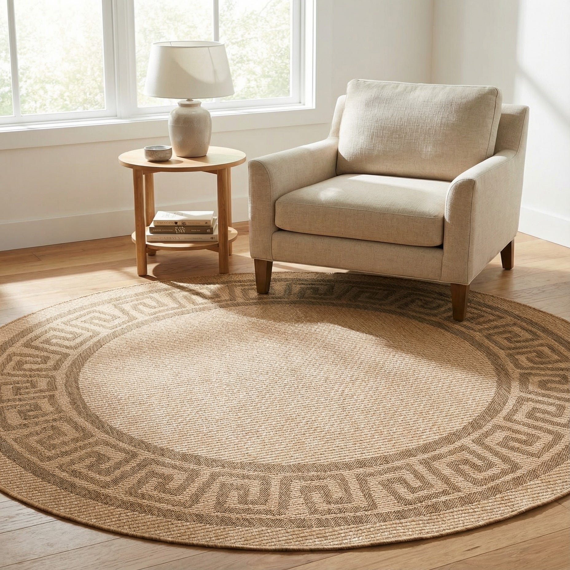 A warm light brown ground sets a neutral stage for a bold circular border rendered in a slightly deeper brown. The border uses a classic Greek-key motif that wraps the rug in an architectural band, giving the piece a structured, timeless look. The surface is low-profile and tightly woven, with a slightly textured, flatweave feel underfoot that stays visually neat and grounded.