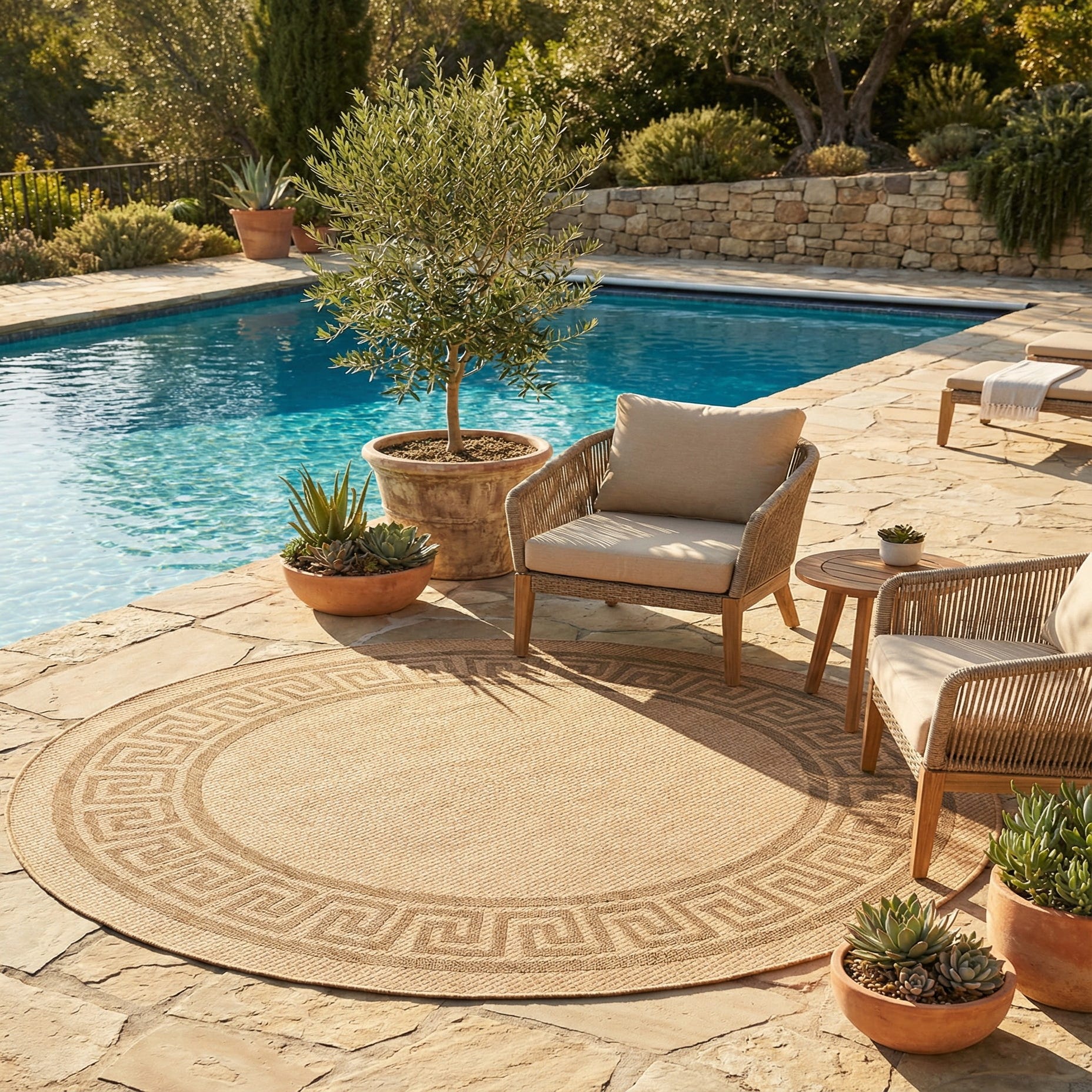 Machine-made from 100% polypropylene, this rug is built for outdoor settings and everyday use while keeping a clean, tailored appearance. It pairs naturally with wood and rattan furniture, linen cushions, and neutral-toned décor, and works well on a covered patio, screened porch, sunroom, or beneath a round bistro or dining table. The light brown palette also harmonizes with coastal, Mediterranean, or transitional interiors that favor earthy, layered materials.