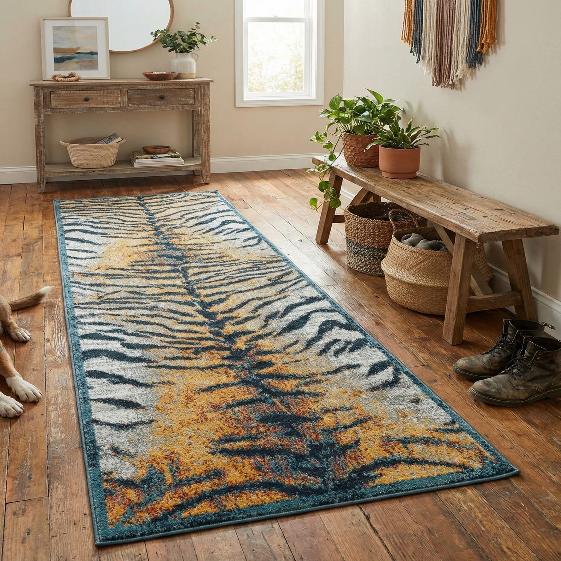 A 6 ft runner rug with a modern tiger stripe pattern in shades of brown, tan, black, and blue, ideal for a hallway.