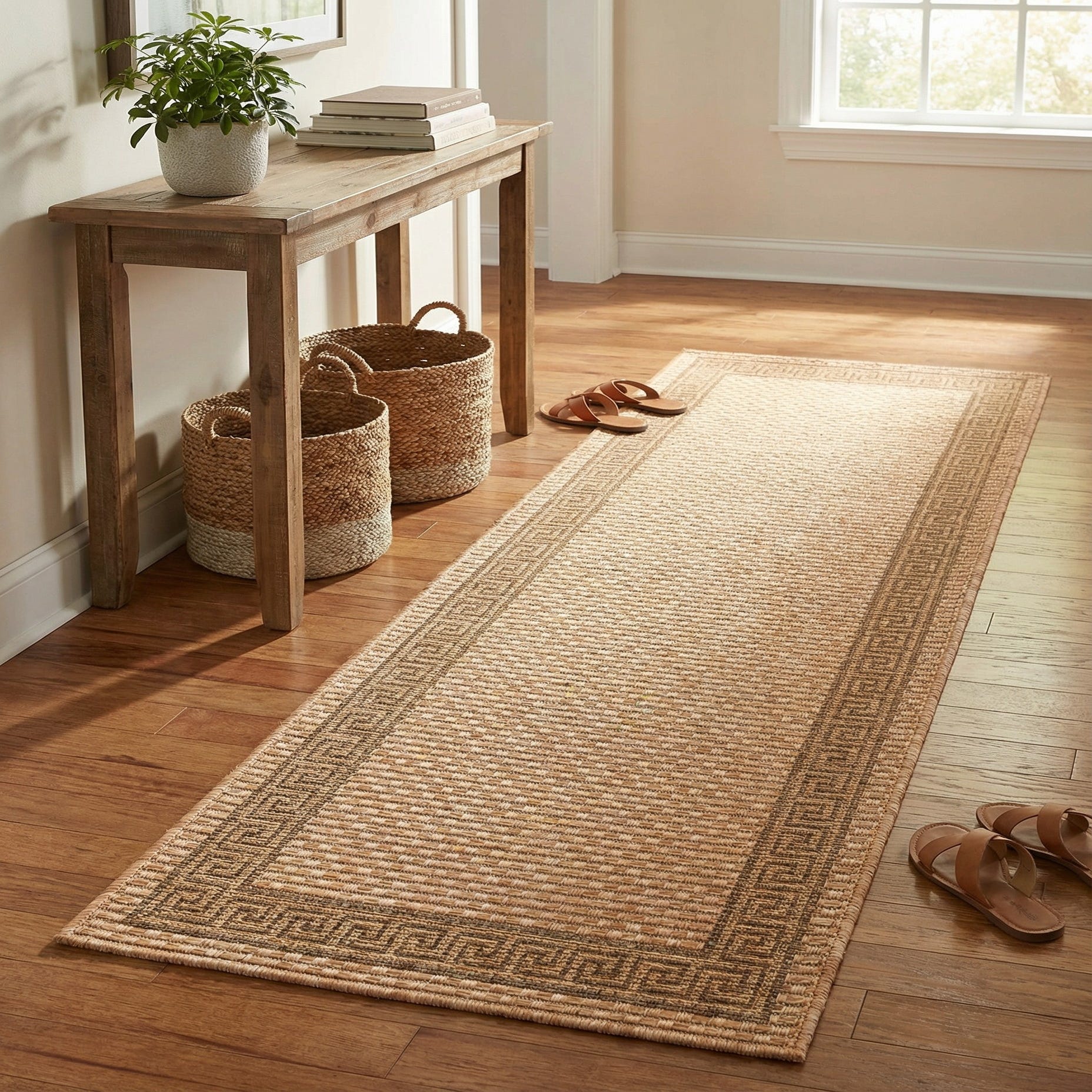 This runner works well in hallways, entryways, kitchens, or screened porches and is suited to indoor/outdoor layouts. Pair it with natural wood or rattan furniture, linen upholstery, and accents in soft blues for a coastal or transitional look, or use it to anchor a Mediterranean or casual farmhouse setting where warm neutrals and subtle pattern support a relaxed, coordinated palette.