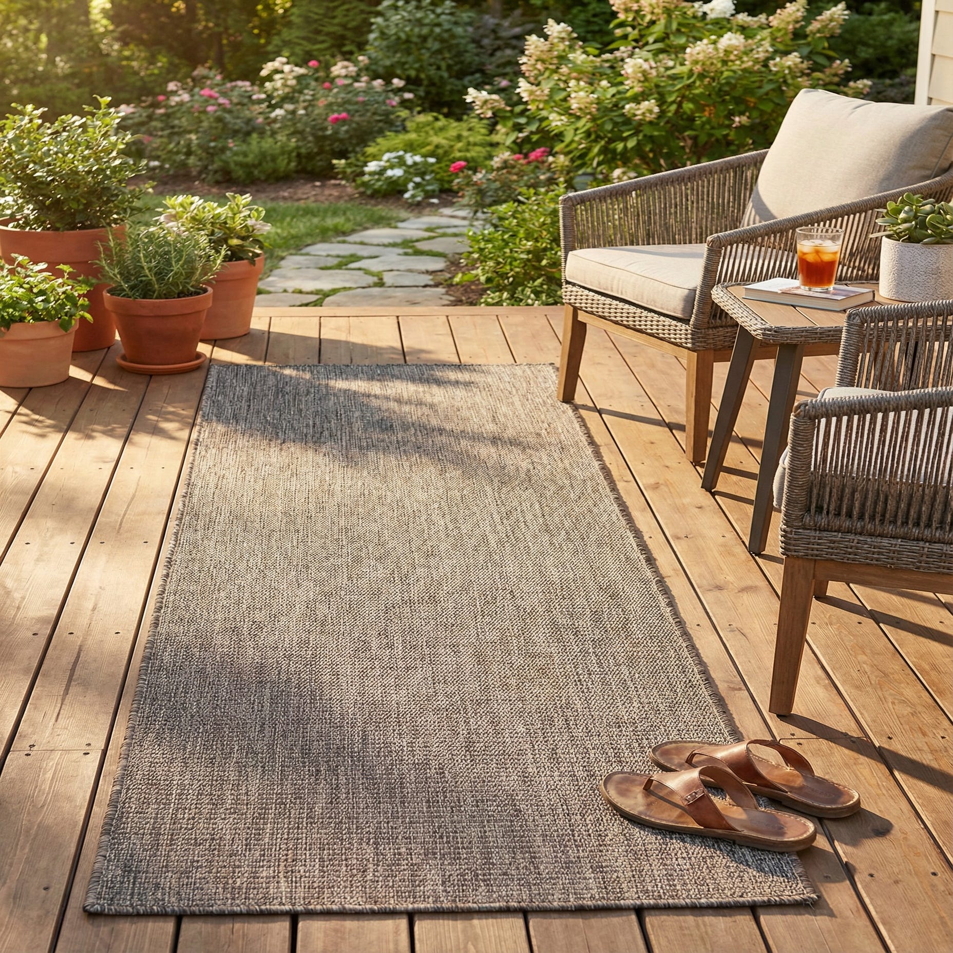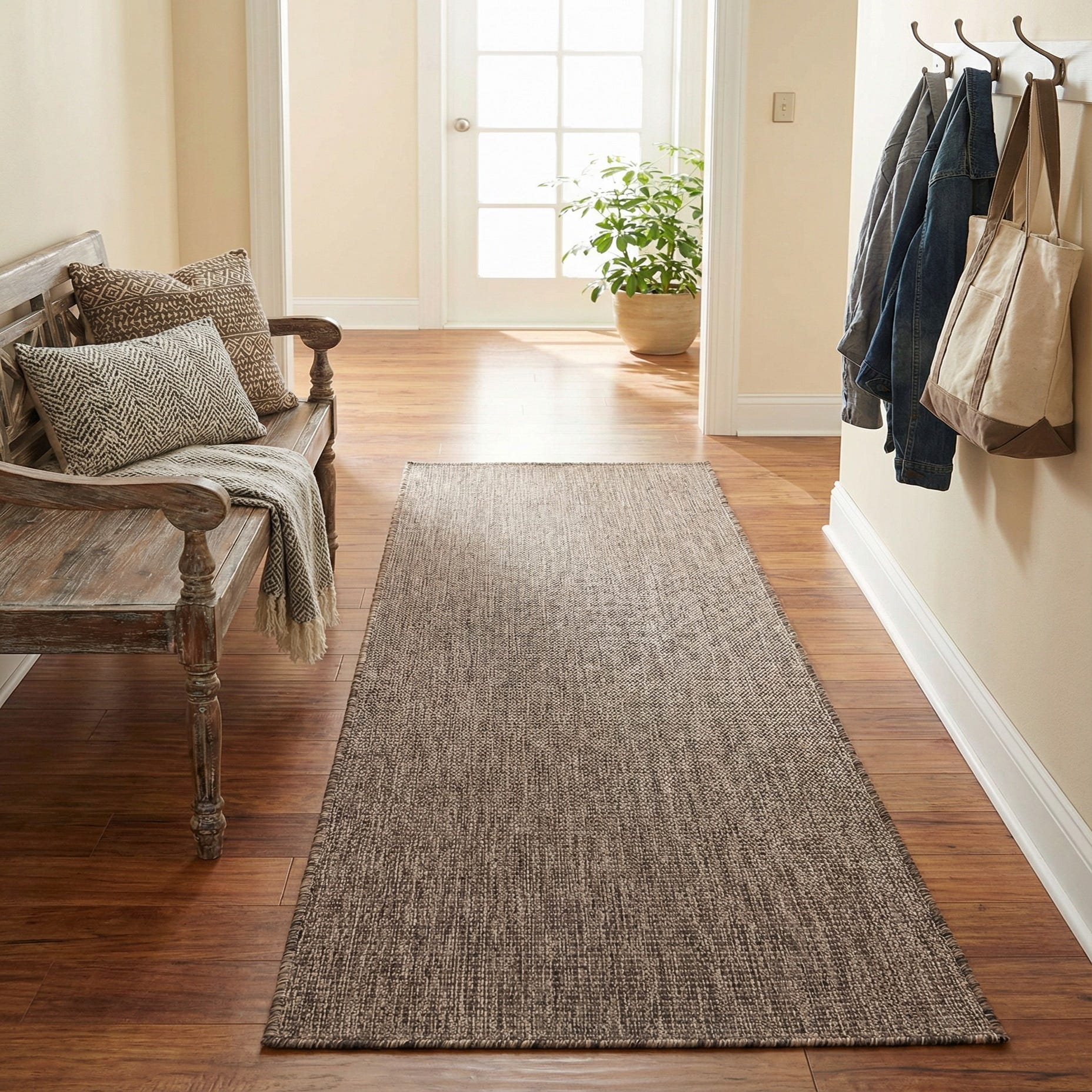 Machine made from 100% polypropylene, the construction delivers a practical, low?pile surface that works well in high?use transition zones. Place it down a hallway or in an entry, use it to define an outdoor?covered porch or kitchen pass-through, or layer it under a narrow dining bench. The warm light?and?dark brown tones coordinate with natural woods, woven furniture, leather accents, and matte metal finishes for casual, contemporary, or farmhouse?inspired settings.