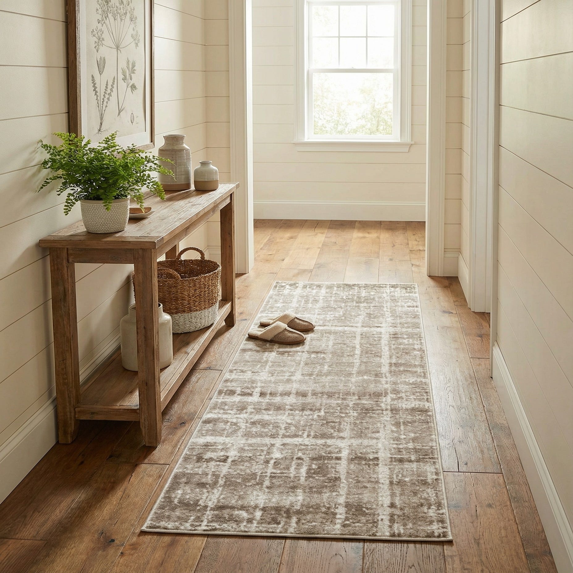Warm neutrals make this piece easy to style: place it in a hallway or entry to anchor light wood floors, or run it alongside a kitchen island for a cohesive, understated look. It pairs naturally with linen upholstery, woven textures, and matte metal accents in modern, transitional, or Scandinavian interiors, and can also layer nicely over a larger rug to add depth without overpowering a room.