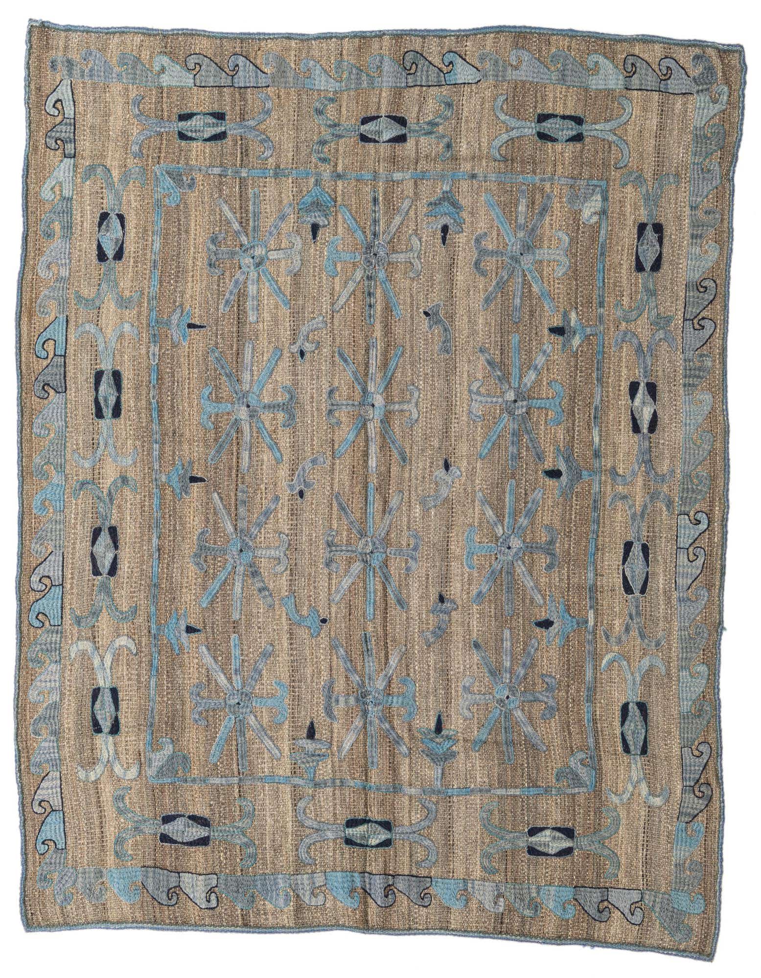 Primary color is Light Brown. Colors in this rug include: Light Brown, Light Blue, Navy Blue, Gray.