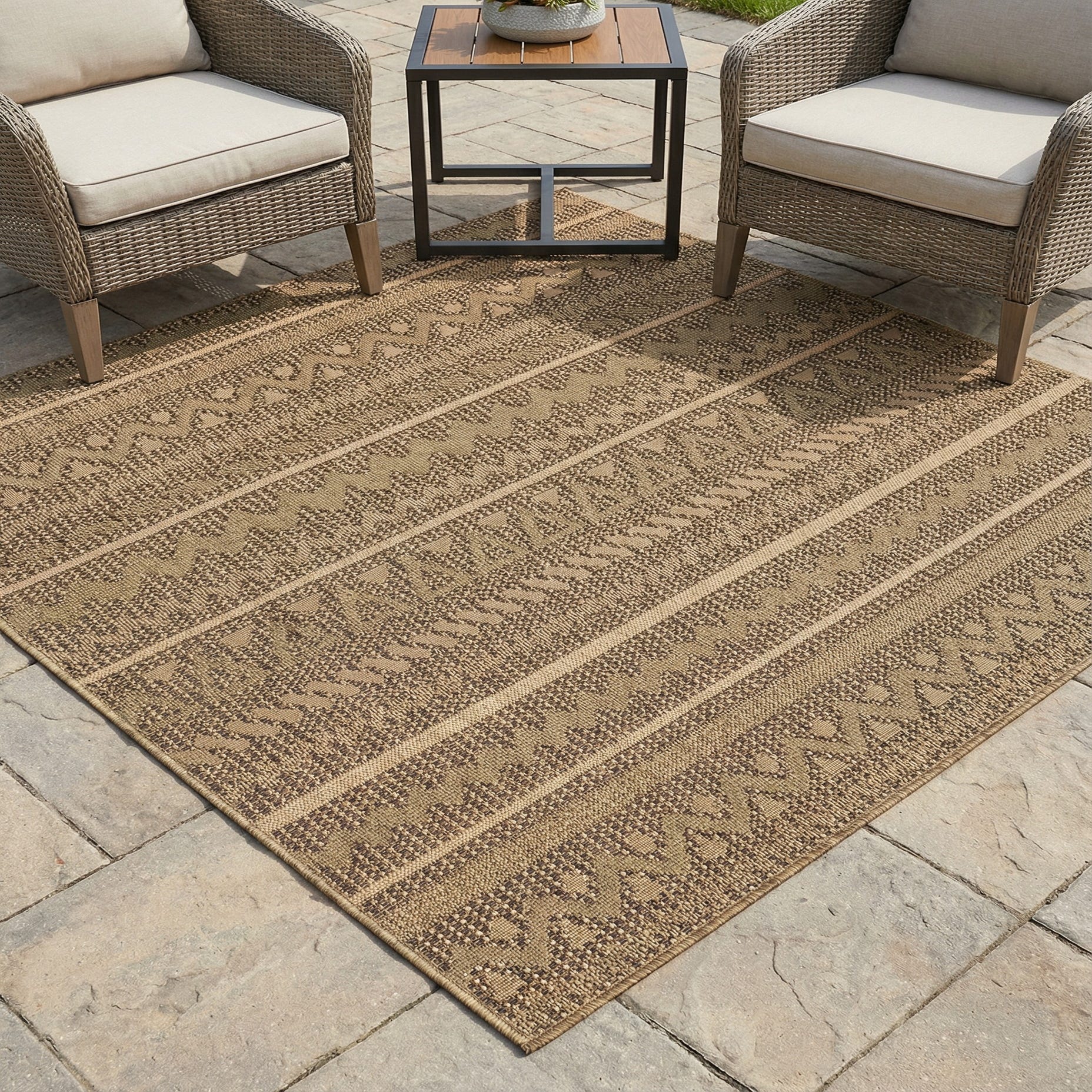 Pair this rug with natural materials and warm woods for a cohesive look—think rattan lounge furniture and weathered teak on a covered patio, or a neutral sofa and brass accents in a casual living room. It also complements modern farmhouse or coastal-cottage schemes, grounding a breakfast nook or defining an outdoor seating area. The restrained palette and linear pattern make it easy to layer with patterned cushions or anchor a simple dining setup without competing for attention.