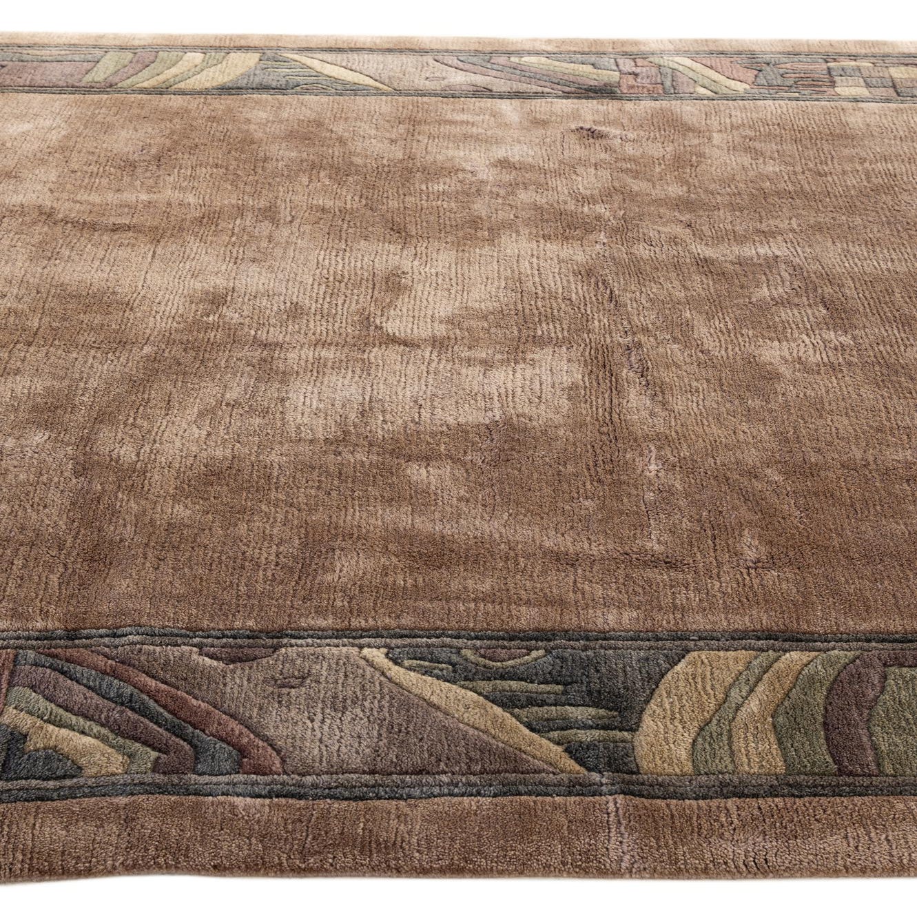 A 6' 5 x 6' 5 square brown wool rug with a modern oriental border featuring abstract shapes in muted earth tones.