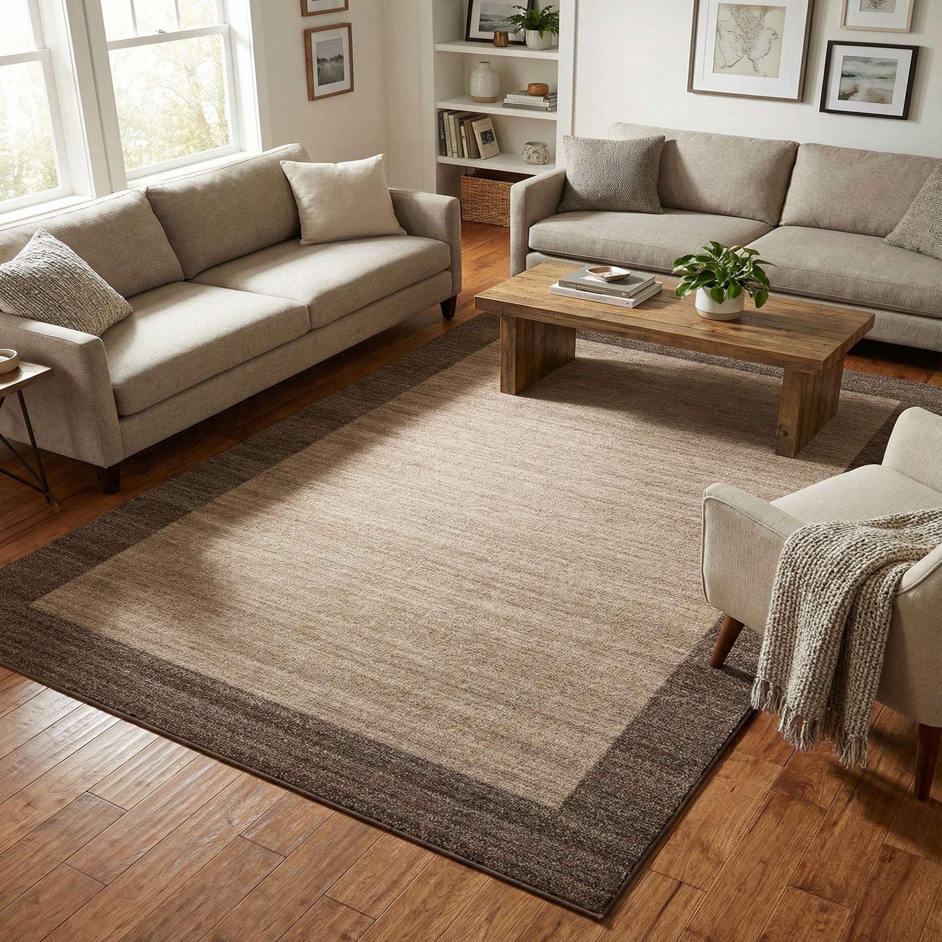 This neutral palette and simple border make the rug a versatile anchor for many rooms—place it beneath a seating area to ground a leather or linen sofa, layer it in a bedroom for a calm, natural base, or center it under a dining table for understated warmth. It pairs well with contemporary, transitional, or farmhouse interiors and complements wood floors, metal accents, and soft textiles for a balanced, lived-in look.