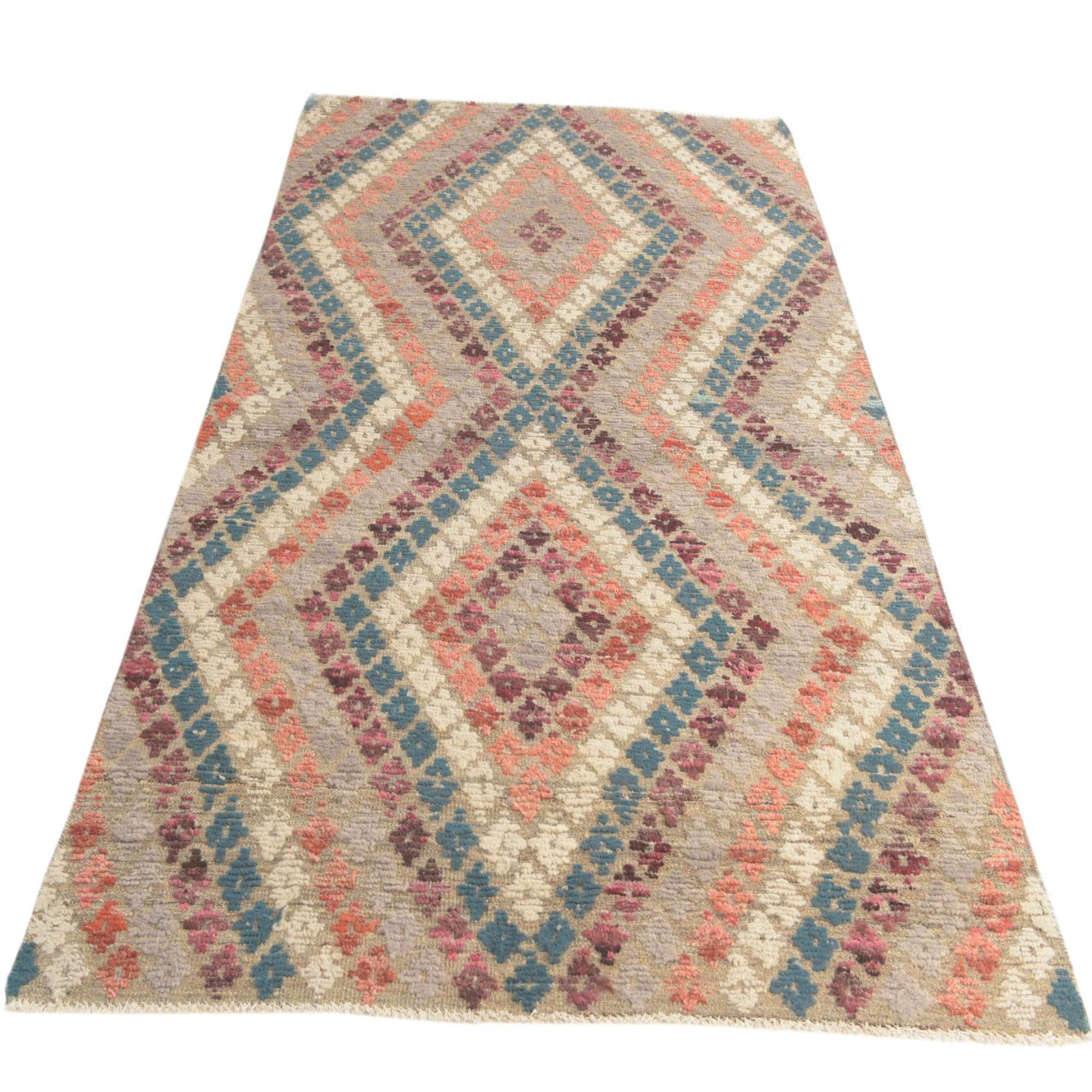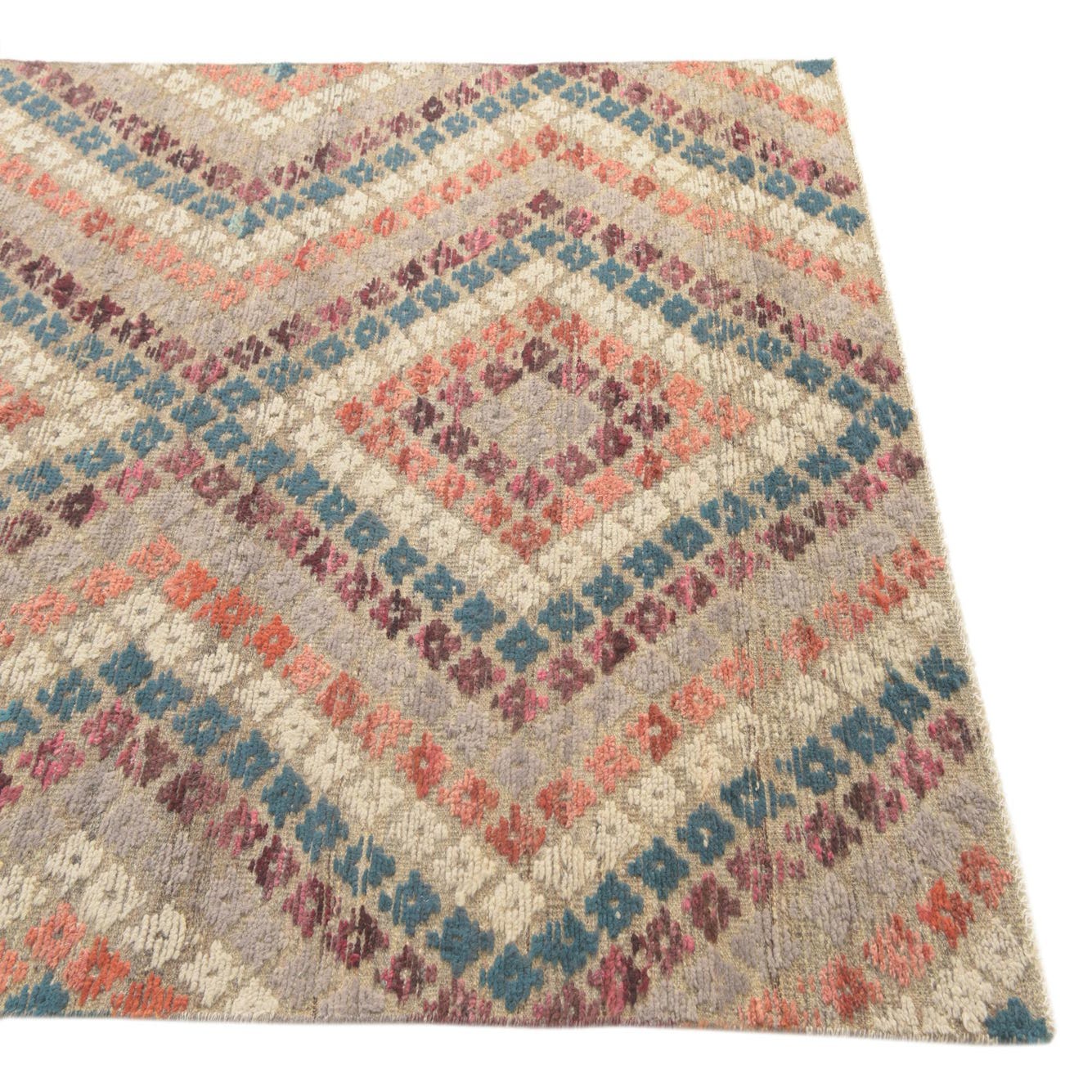 A rectangular 6x9 Darya wool rug with a modern abstract diamond pattern in browns, tans, oranges, and teals.