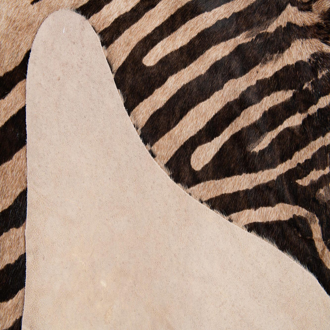 A 6'4" x 6'7" freeform cowhide rug with a modern zebra print in varying shades of brown and tan.