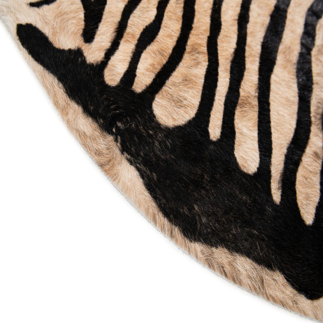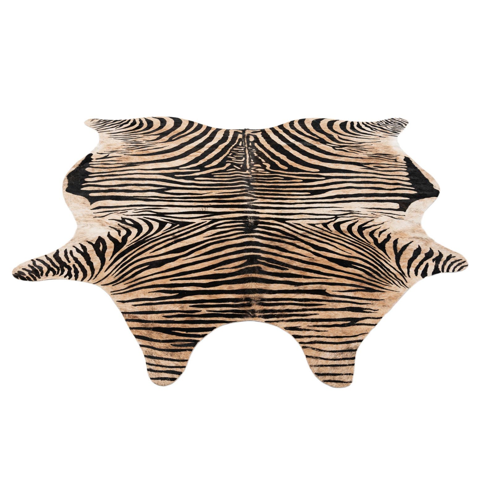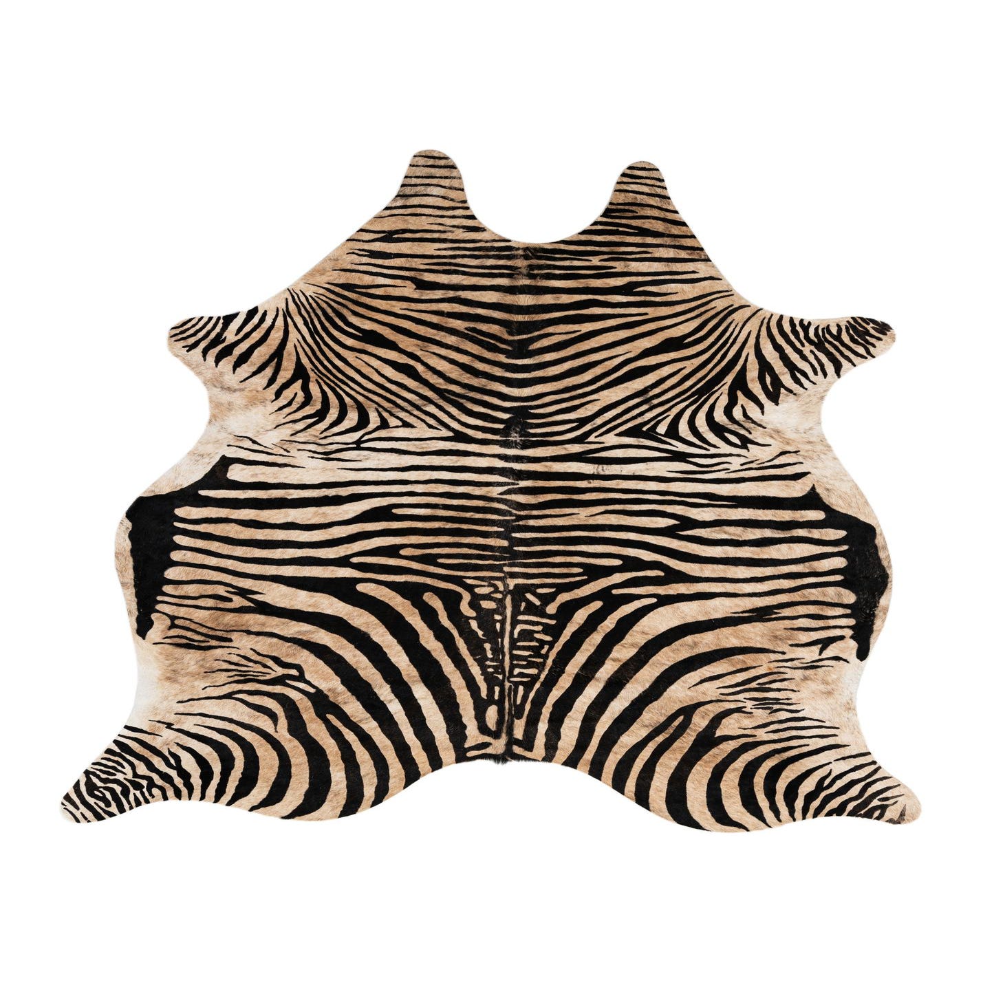 A 6' 6 x 7' 0 freeform cowhide rug with natural brown and tan zebra stripes, suitable for a modern living room.