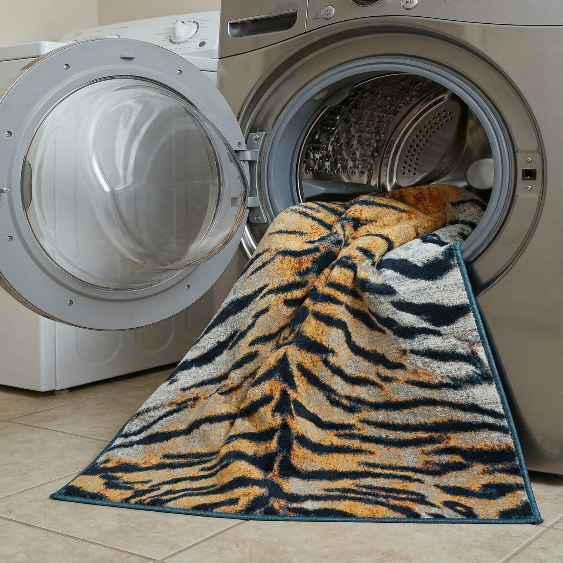 A bold stripe motif stretches across a light brown ground, where black banding cuts crisp, organic lines through fields of gray and ivory. The pattern reads like an abstracted animal stripe with a gently distressed overlay that adds visual texture and depth. Machine-made from 100% polyester, the surface has a low, dense pile with a soft hand and a subtle sheen that highlights the color contrasts and keeps the design feeling modern and tactile.