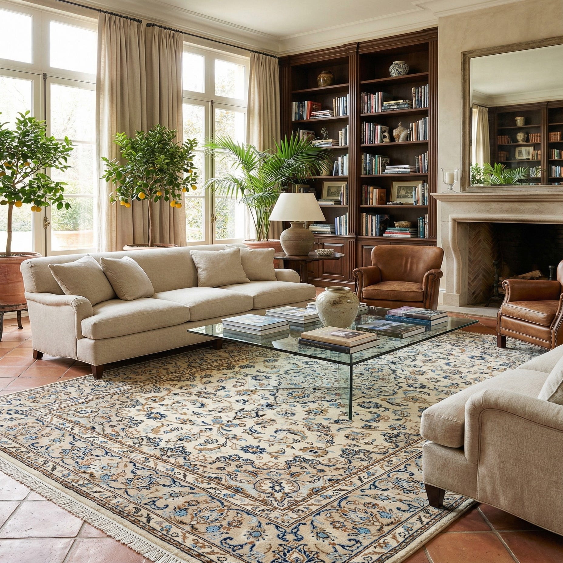 A 6x9 rectangular Kashan Persian rug in shades of brown and tan, featuring an intricate floral medallion pattern.