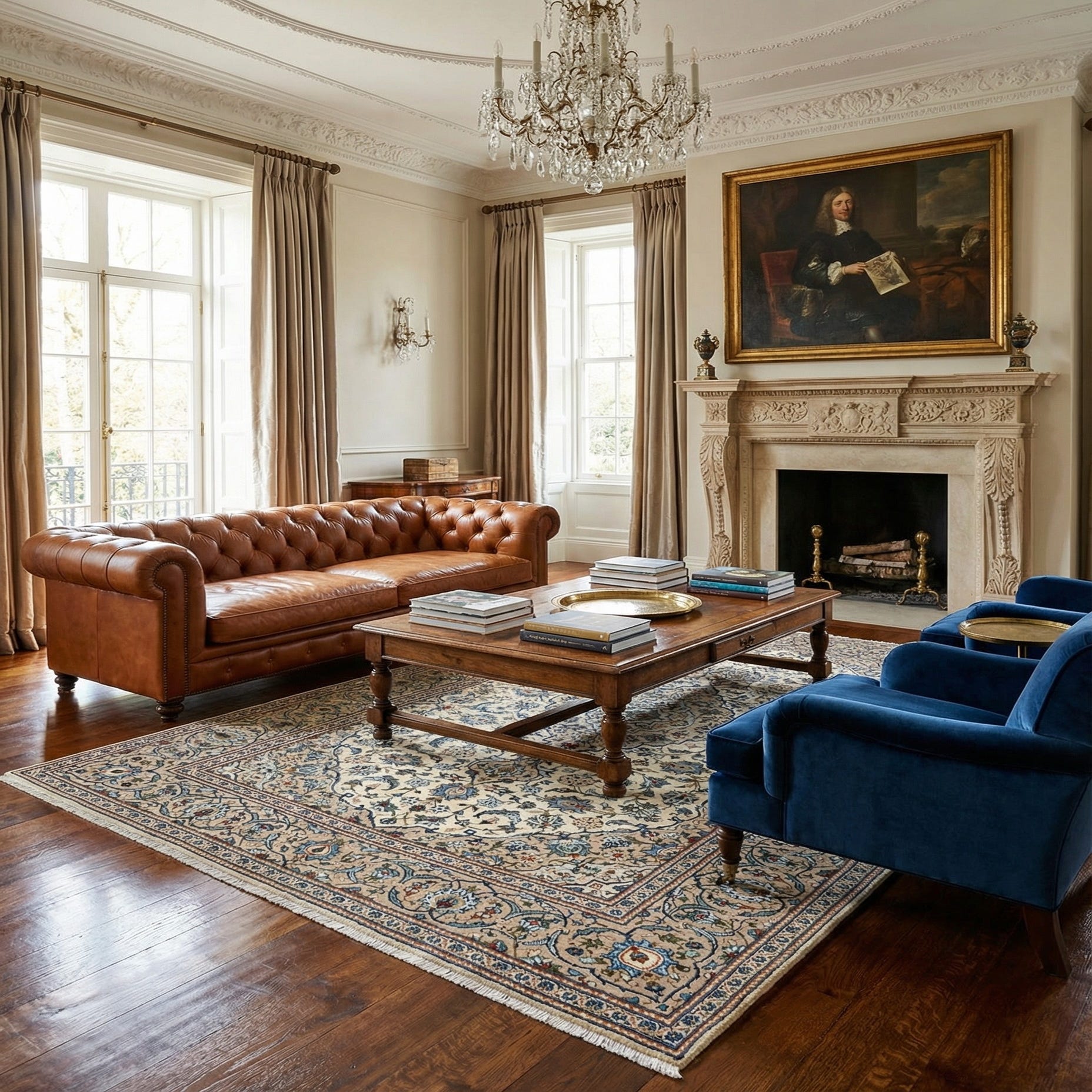 A rectangular 6x9 Kashan Persian rug in shades of cream, brown, and blue, featuring an intricate floral medallion pattern.