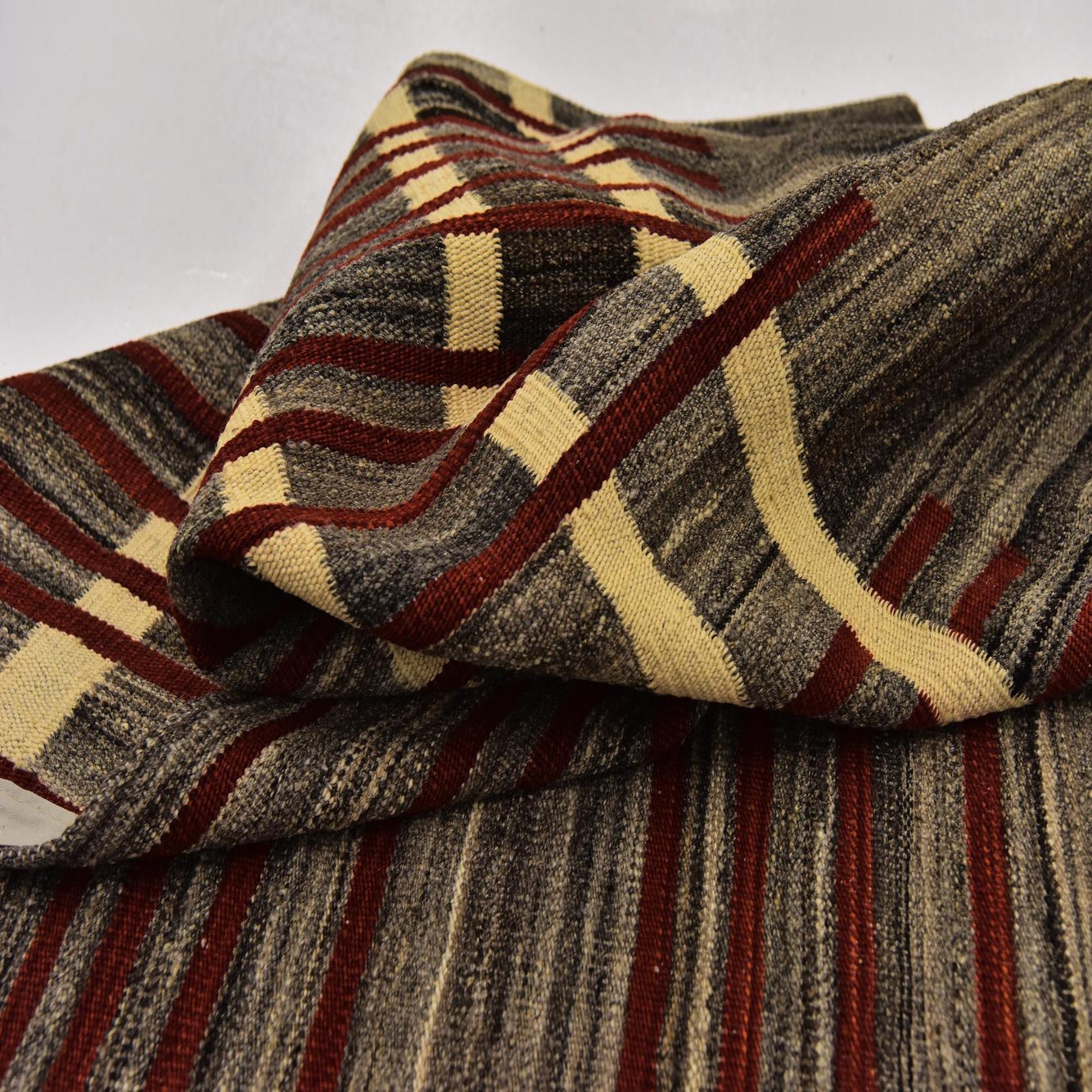 A 6x9 rectangular Kilim Modern rug with a flatweave, featuring vertical red stripes over a textured brown and tan background, intersected by horizontal tan lines.
