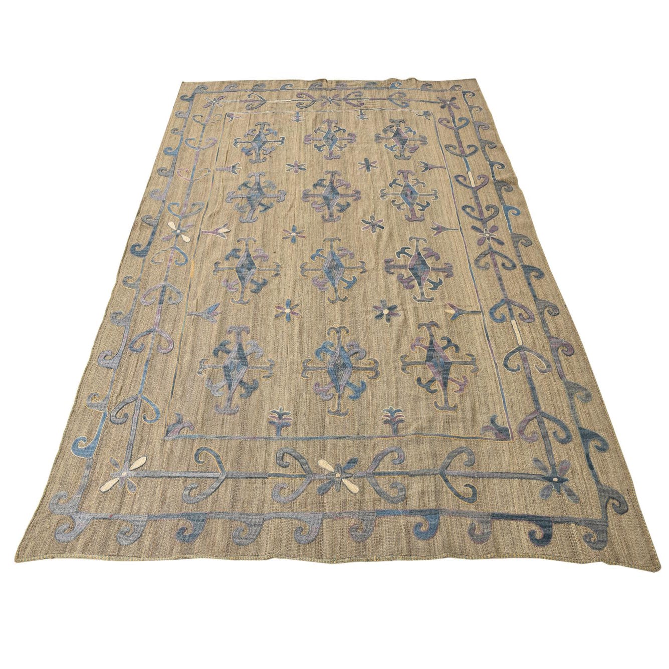 The Kilim Suzani rug, measuring 6x9, is handwoven from 100% wool, offering a rich texture and durability. Its light brown background serves as a subtle canvas for the array of decorative elements that adorn the rug. The pattern includes intricate motifs in blue, gray, purple, ivory, and violet, creating a harmonious blend of colors that evoke a sense of traditional craftsmanship and contemporary appeal.