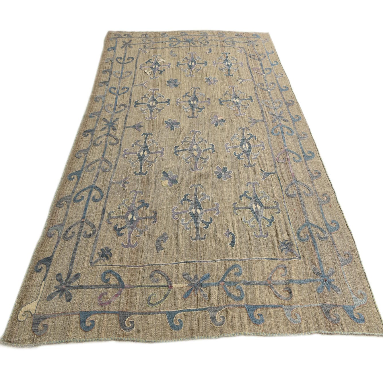 A 6x9 rectangular Kilim Suzani rug featuring a tan background with blue and purple tribal patterns and a decorative border.