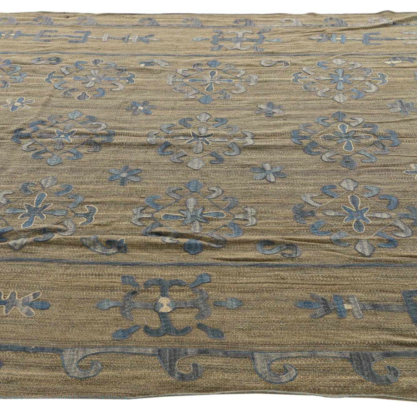 The Kilim Suzani collection presents a 6x9 hand-woven rug crafted from 100% wool. This piece showcases a light brown background complemented by a pattern that features hues of gray, ivory, and navy blue. The design incorporates traditional suzani motifs of botanical and medallion patterns that communicate a sense of heritage and artistry. The texture of the wool provides a tactile appeal that is both durable and comfortable underfoot.