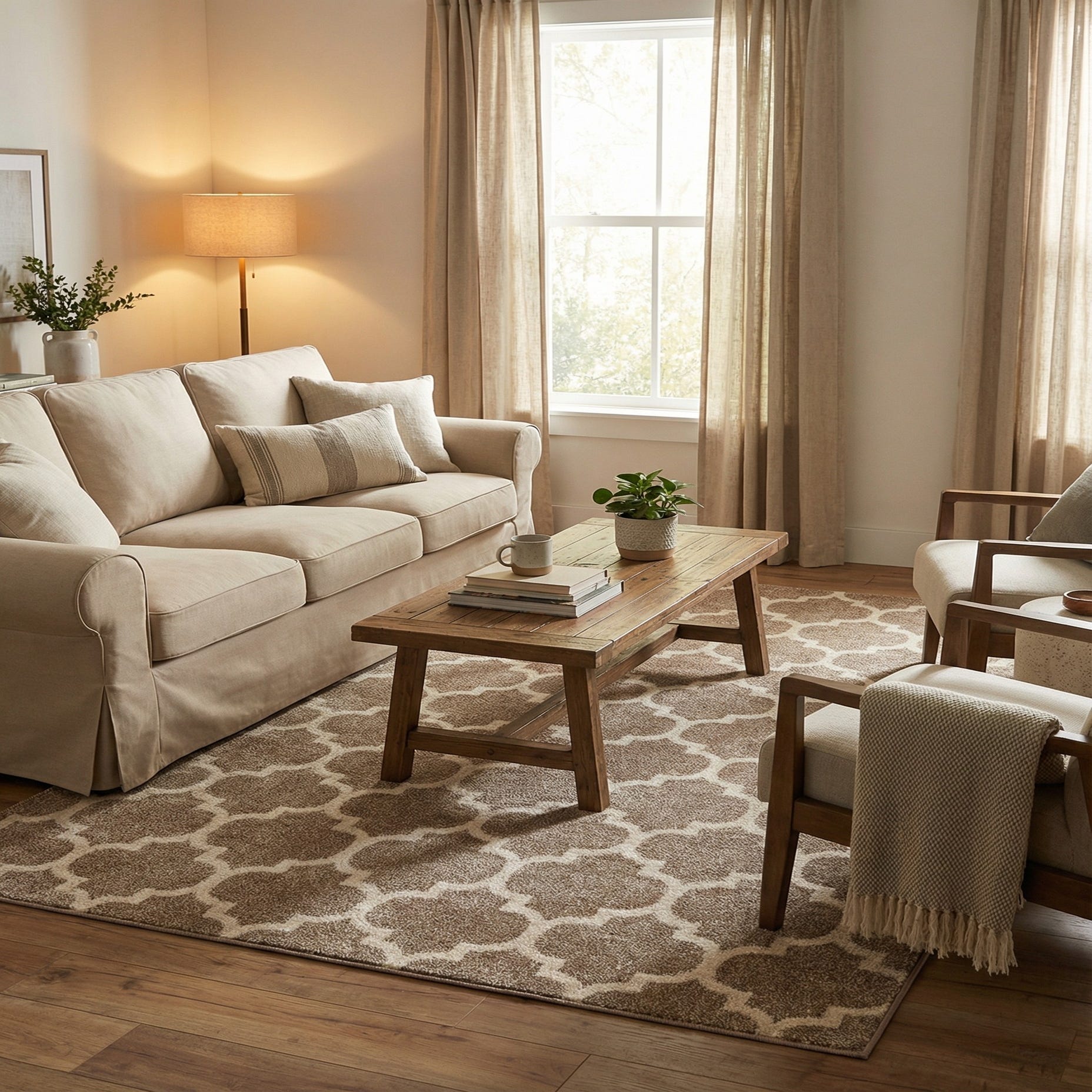 Machine-made from 100% polypropylene, the rug has a low, dense pile that feels soft and springy underfoot while holding the pattern definition. It works well as an anchor in a living room beneath a sofa and coffee table, layered in a bedroom under the foot of the bed, or placed in a home office or entry where a neutral, structured look is desired. Pair it with natural wood tones, linen upholstery, muted leathers, or brushed metal accents to complete a calm, cohesive interior.