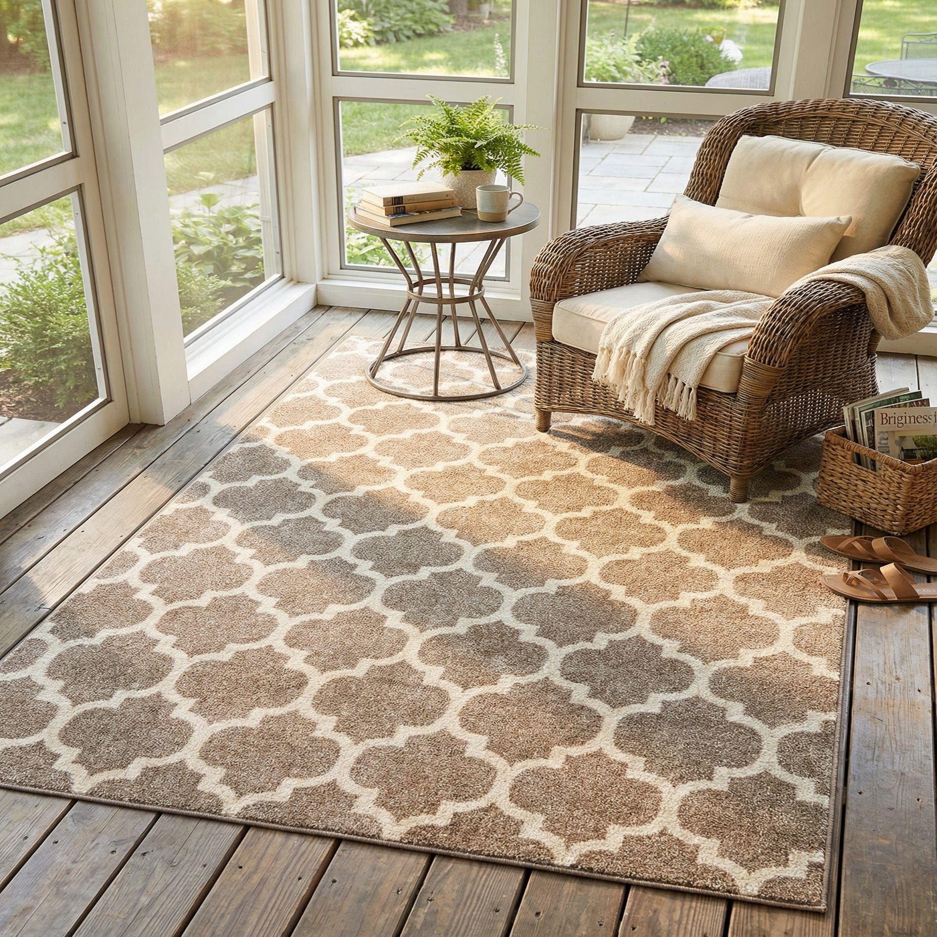 A warm light brown field provides the backdrop for a repeating beige quatrefoil lattice that brings a measured geometric rhythm to the surface. The pattern is classic but updated, lending a transitional look that pairs with both contemporary and traditional furnishings. The beige motif sits slightly raised against the light brown, creating a subtle contrast and visual depth without overwhelming the space.