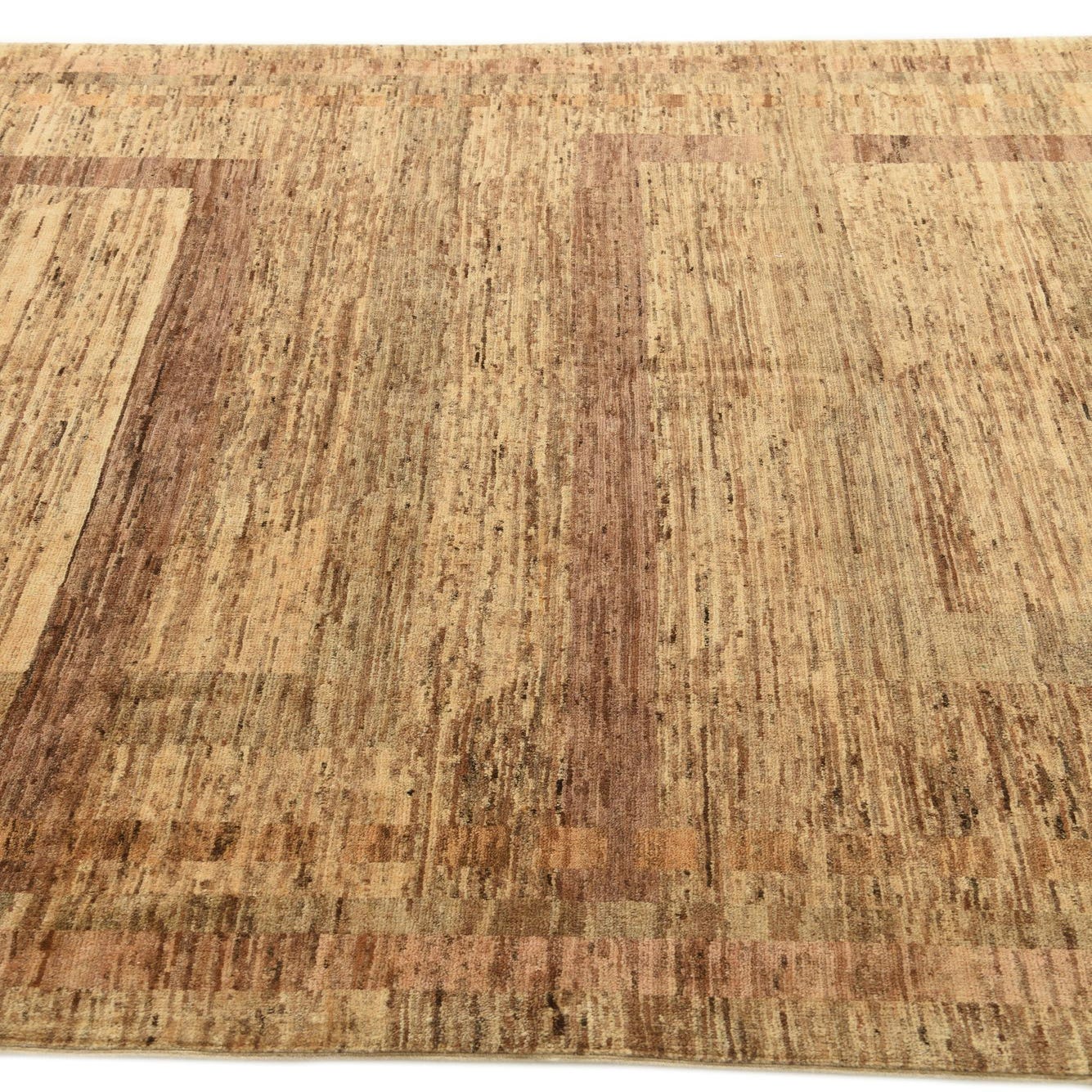 This Modern Ziegler rug, hand-knotted from 100% hand-spun wool, is a 6x9 piece that presents a harmonious blend of light brown, beige, brown, and ivory hues. The background color of light brown offers a warm and inviting foundation, while the intersecting blocks and lines introduce a subtle geometric pattern. The texture is indicative of the high-quality wool and traditional hand-knotting techniques, providing both durability and a tactile underfoot experience.