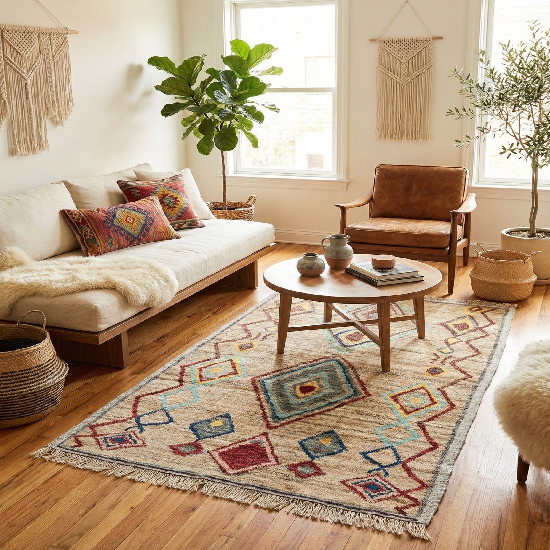 A 6x9 rectangular Moroccan shag rug with a tribal diamond pattern in browns, tans, red, blue, and yellow.