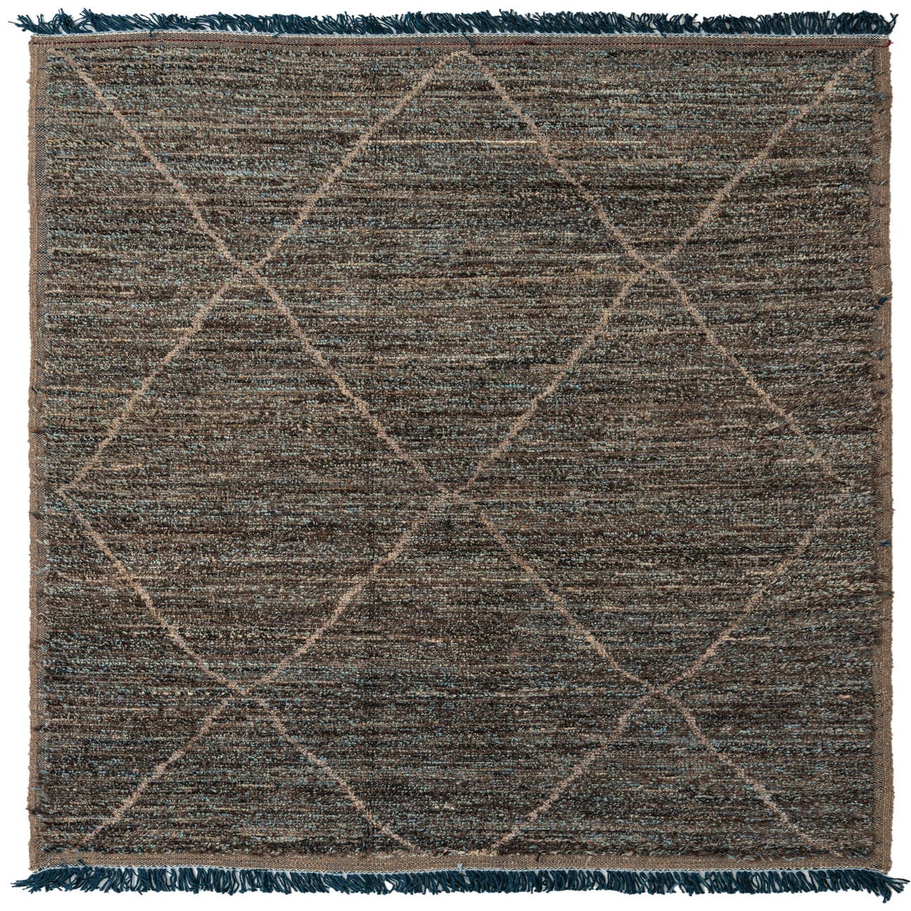 A 6x9 rectangular brown and tan wool shag rug with a modern tribal diamond pattern and dark blue fringes.