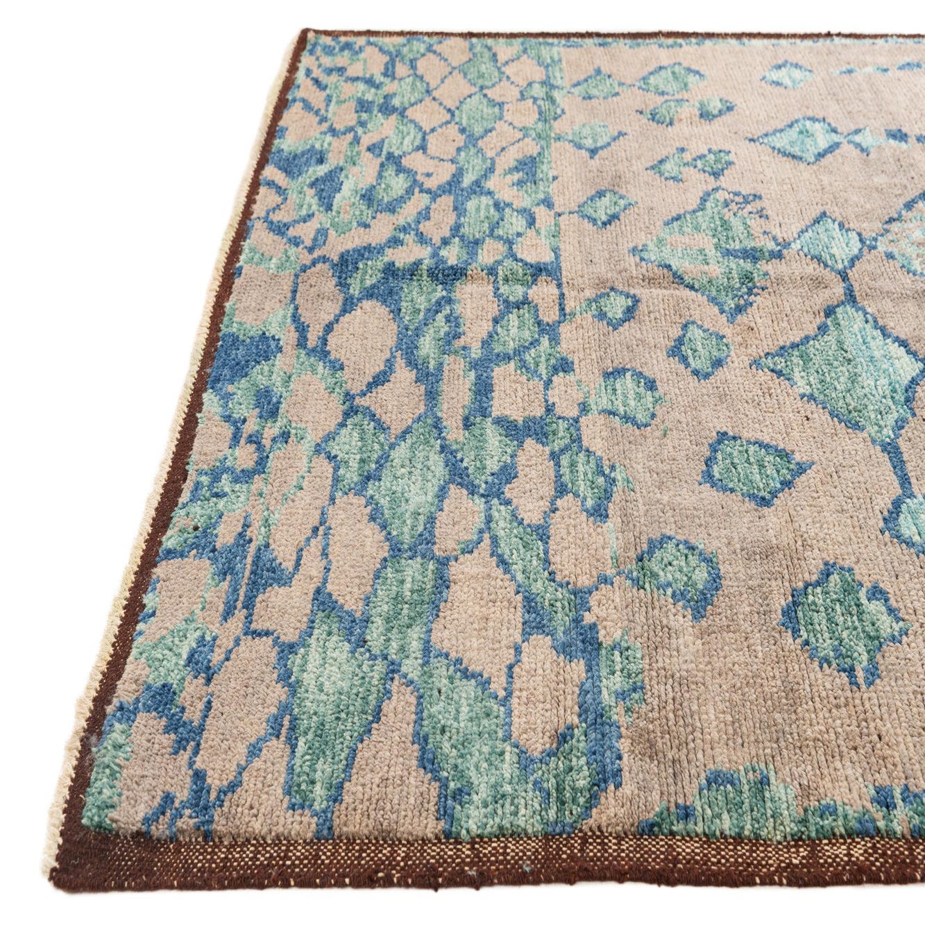 A 6x9 rectangular Moroccan shag rug with a brown background and abstract tribal patterns in shades of blue and green.