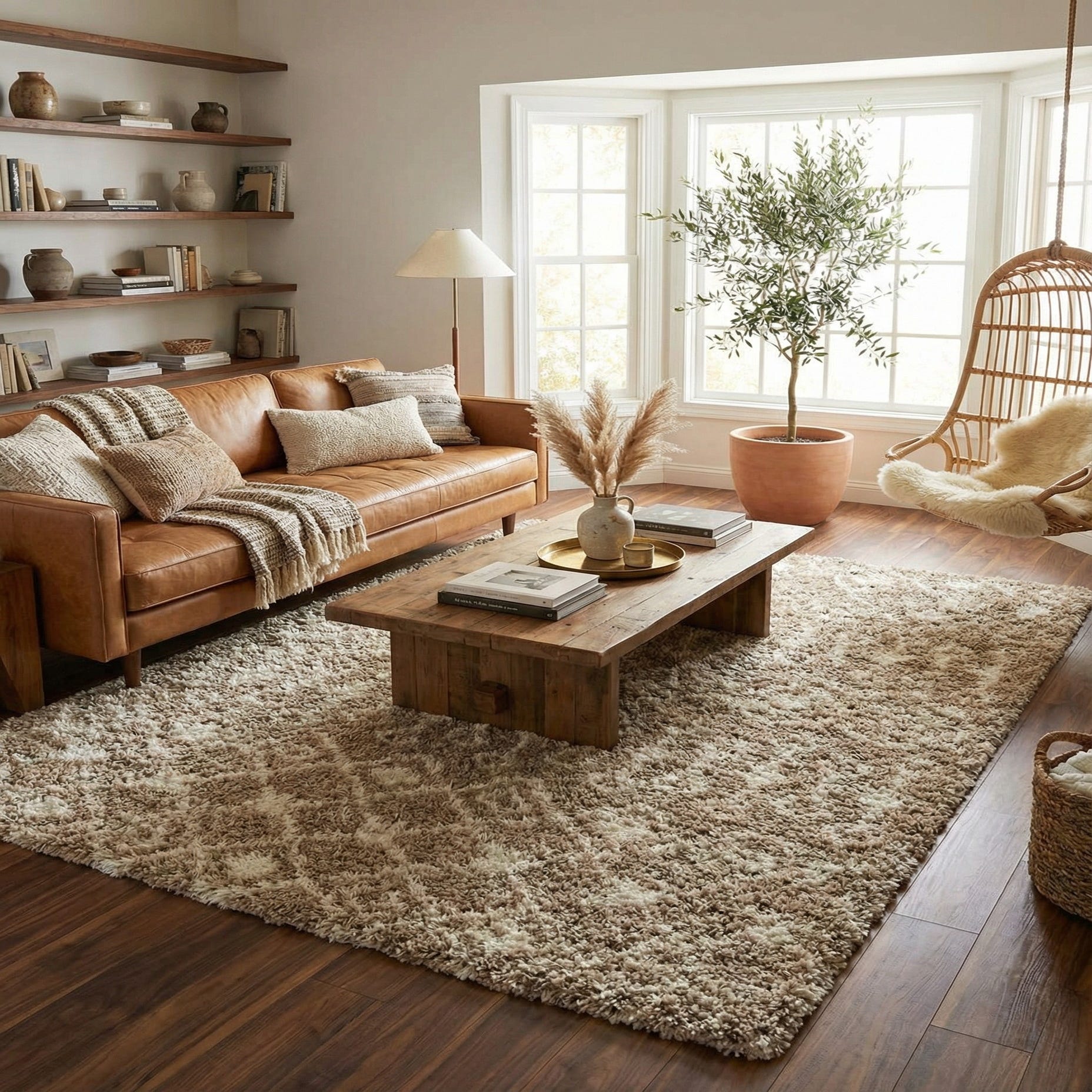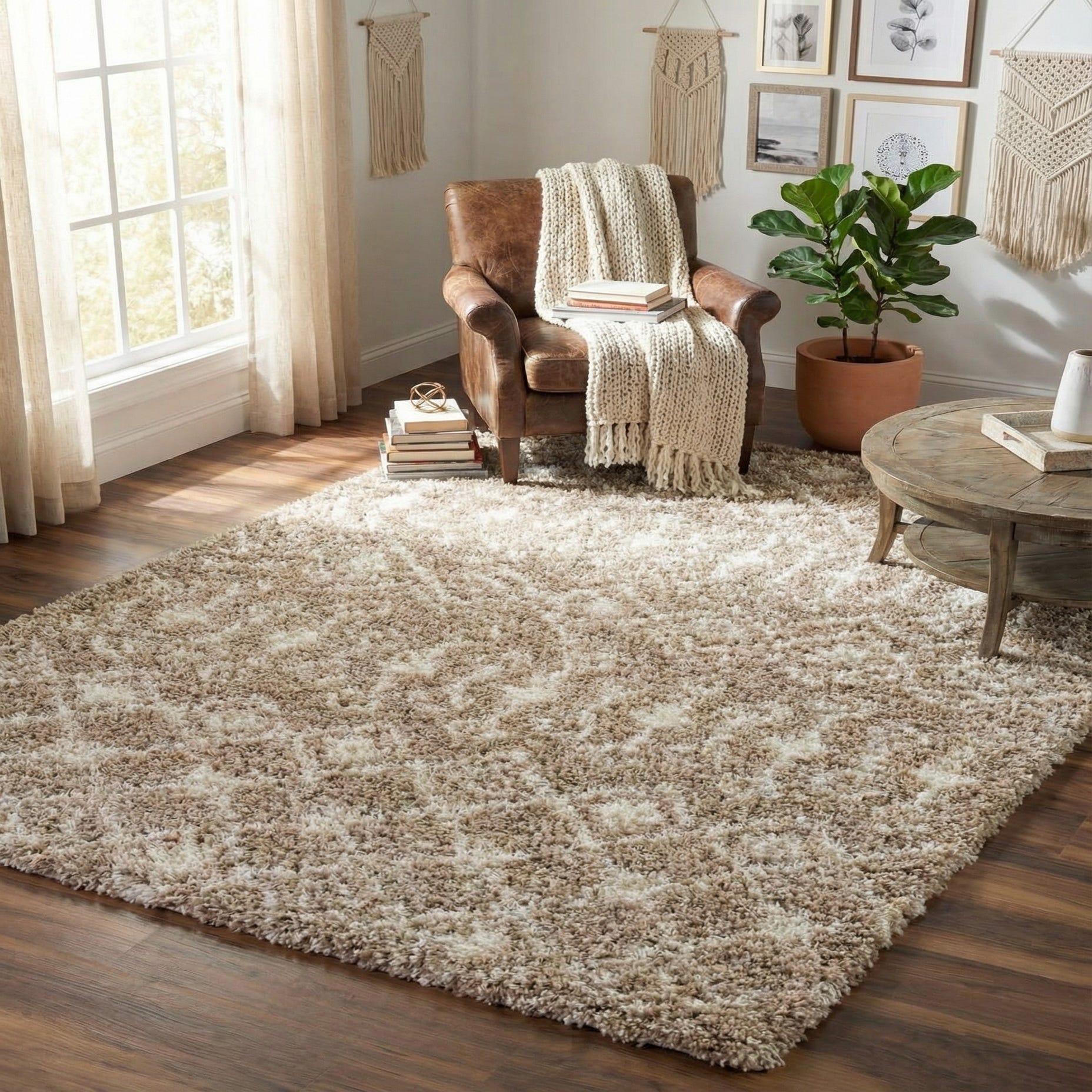 This Moroccan Trellis Shag rug would be a complementary addition to a variety of interior styles, including bohemian, modern, and contemporary settings. Its neutral tones and simple pattern allow it to blend seamlessly with a range of color schemes, from monochromatic to more vibrant decors. It would work exceptionally well in living rooms, bedrooms, or any other area where a cozy atmosphere is desired.