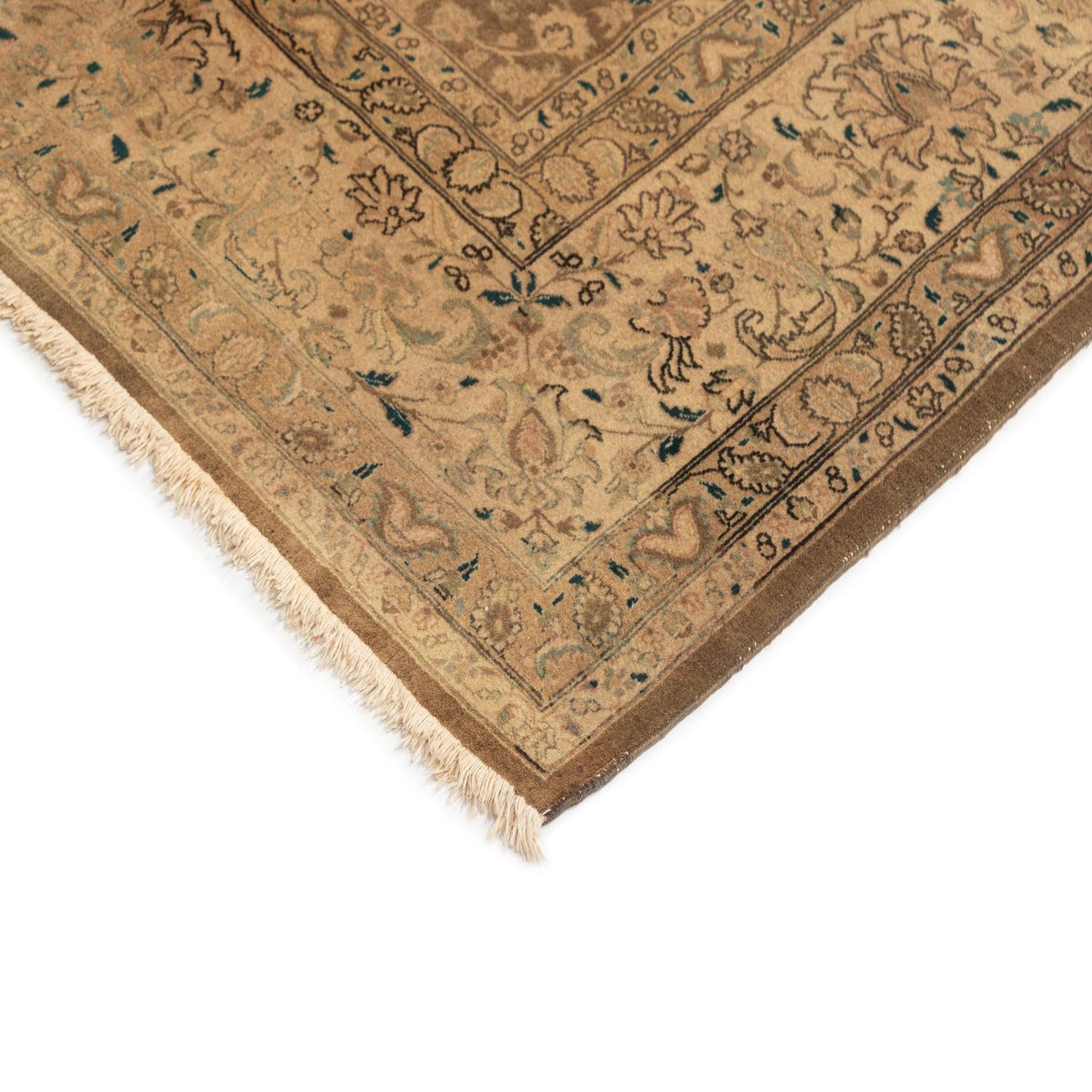 A 6x9 rectangular Persian wool rug in shades of brown and tan with intricate floral and paisley patterns.