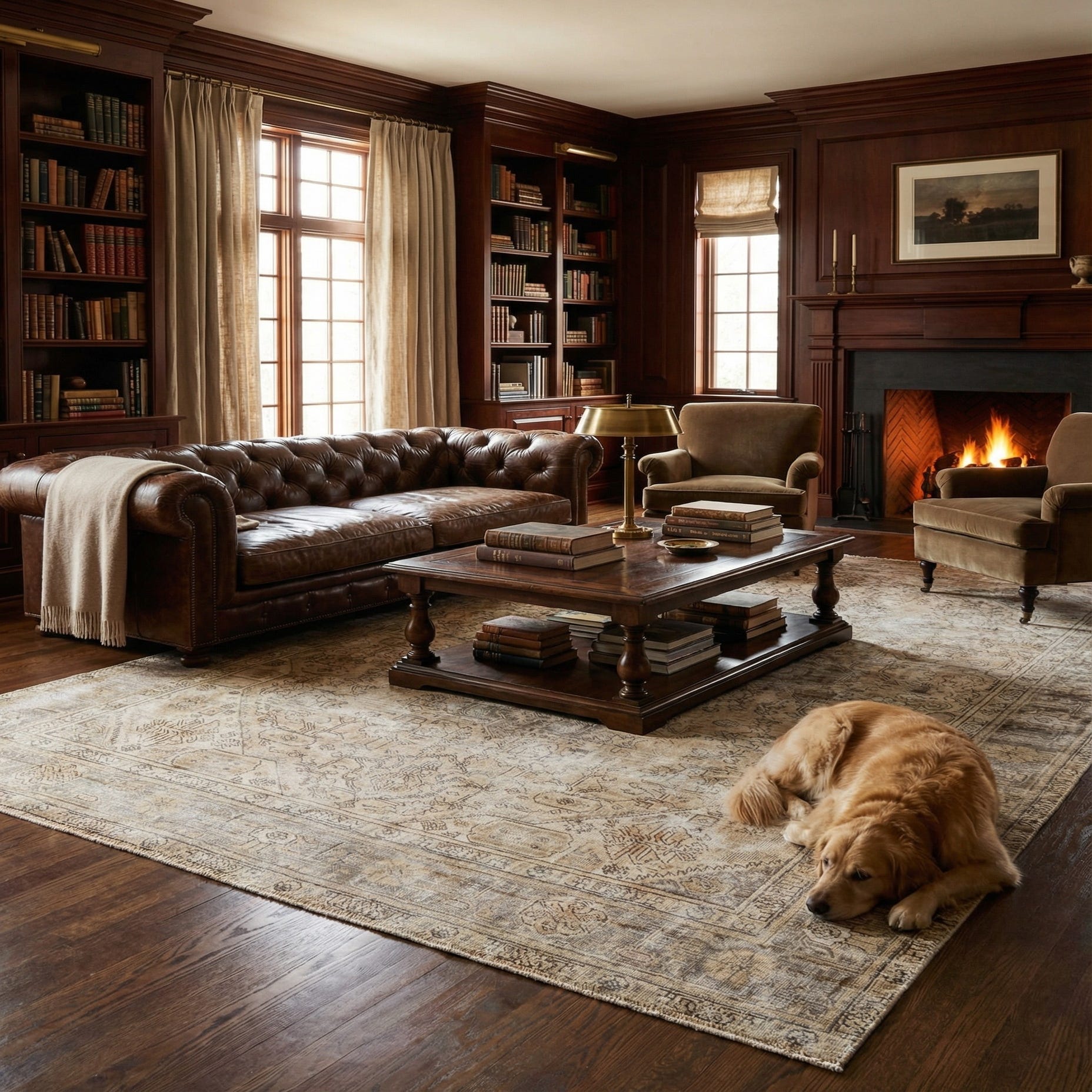 This rug would work well in interior design scenarios that appreciate the patina of age, such as vintage-inspired settings, or in more contemporary spaces where it could offer contrast and depth. It could be tastefully paired with rich leather furnishings, wood accents, and a palette that includes neutral tones. Additionally, its durable wool construction makes it a suitable choice for both living rooms and dining areas where it can add texture and layered sophistication.